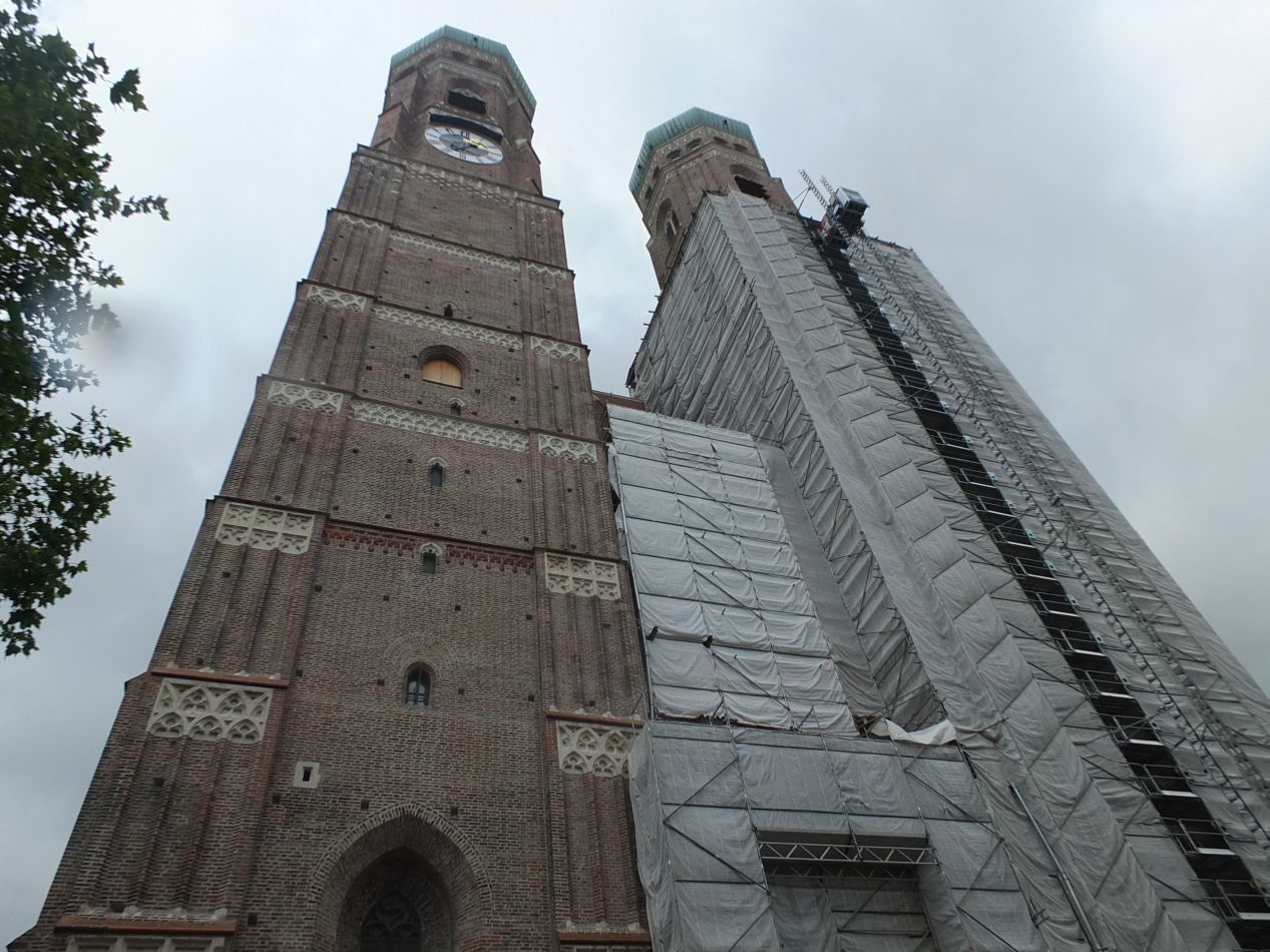 My next stop was... yet another church. I honestly wasn't doing this deliberately, they simply all happened to be very close to one another as I walked towards the center of town. This one was Munich's cathedral, or "Dom" as it's known in German. The building was also referred to as the Frauenkirche, with the official English translation rendering as the Cathedral of Our Dear Lady. The Dom's best-known feature is the pair of green tipped towers that rise above the rest of the building, easily visible from the main street despite the intervening buildings. The rest of the structure was made up of bricks and looked unremarkable from the outside. There was also quite a bit of construction taking place which made it hard to get a good picture of the exterior. The Dom was constructed in the late 15th and early 16th centuries, and unlike earlier medieval cathedrals was built in a span of only two decades. It was almost completely destroyed by bombing during World War II, and most of what can be seen today is a reconstruction. The inside of the Dom used the familiar Gothic design, with a high vaulted ceiling, two rows of pillars running down either side, and stained glass on the walls. Maybe it was due to the fact that I had seen so many Gothic cathedrals at this point, but I found this one to be somewhat on the bland side. Perhaps the most noteable feature was the row of saints mounted on wood paneling that ran back behind the main altar on either side. I had been expecting this cathedral to be the religious highlight of my stop in Munich, but there just didn't seem to be that much here to see. I found the St. Michael Kirche to be the more interesting structure in its own bombastic way.