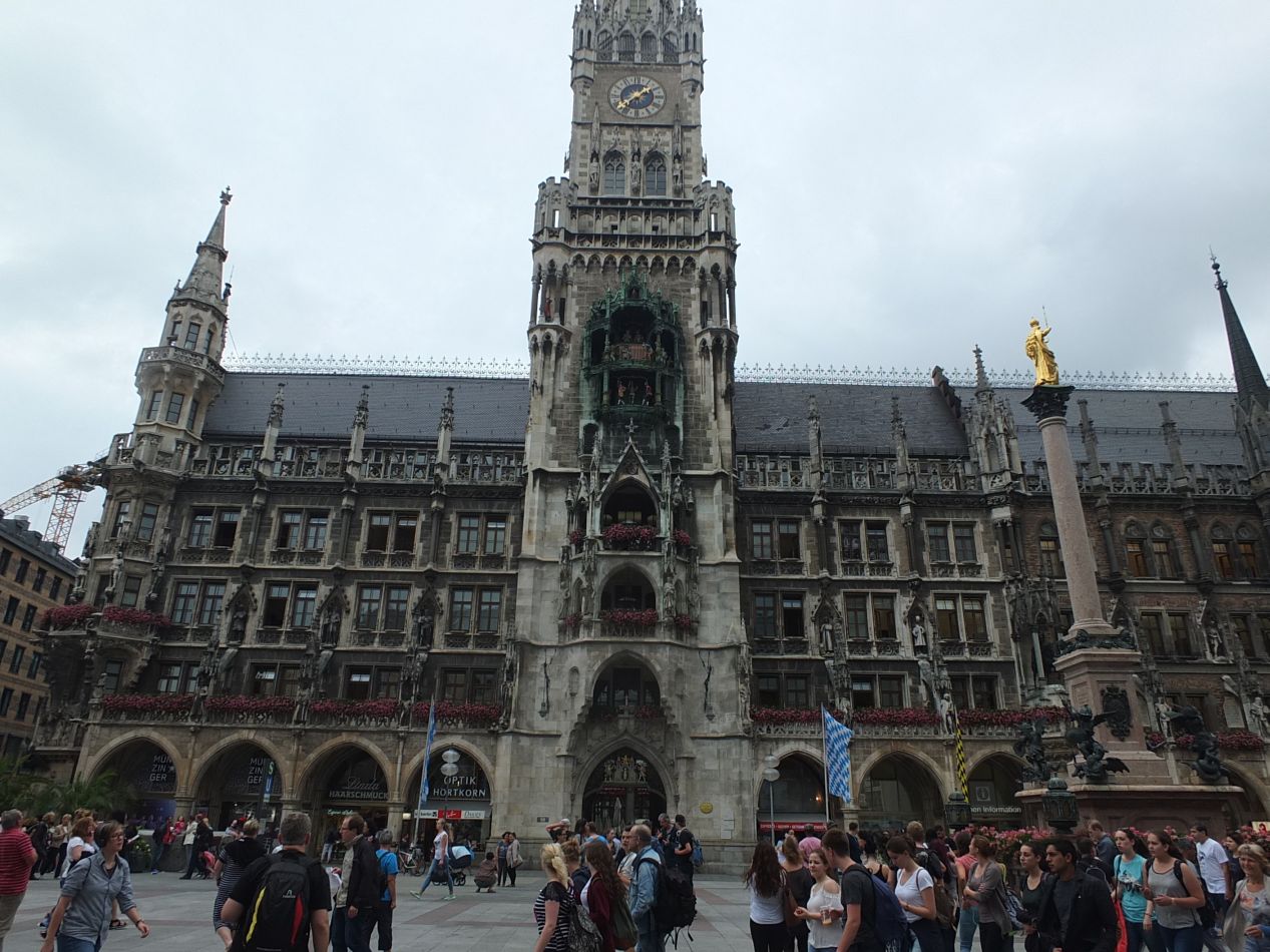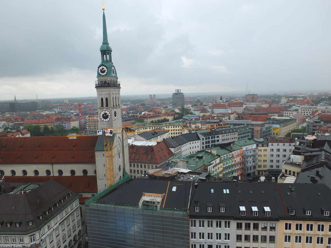I had actually gone into the Neues Rathaus to take the elevator up to the observation deck at the top of the central clock tower. While this might not have been quite so high up as Cologne Cathedral, the vantage point was still plenty to see above the buildings and get a sweeping view of central Munich. Off to my east, I could see the white structure with pointed tops that had served as the original town hall. Back behind me to the west lay the Dom, and from up here it was more obvious that this was the largest church in the city. Immediately below me was the Marienplatz, the view marred slightly by the construction taking place on one of the buildings at its far end. The gloomy weather that had hung over the city for the last few hours also finally began to turn to rain, and I noticed umbrellas starting to pop out above the heads of the people walking below. Standing in an exposed position at the top of a clock tower while the rain began to fall didn't seem like a very good idea, and I headed back inside once I'd finished looking around.