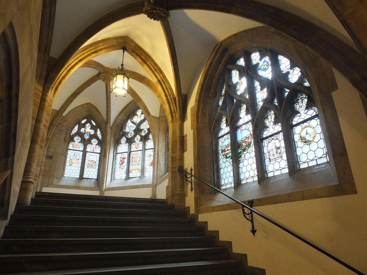 Unlike many of the other town halls that I had visited thus far, the Neues Rathaus was freely open to the public. Inside it felt like a combination of a cathedral and a giant oversized hunting lodge. There were all of the familiar Gothic elements here, between the arched ceilings and the stone pillars, but they were combined together with multiple levels of stairs and what almost felt like a maze of twisting passages. I couldn't help but think that this would be an amazing place to play Hide and Go Seek as a child. Then there were the stained glass windows. Typical for a structure that wanted to emulate medieval stylings, the windows in the Neues Rathaus were beautifully illustrated in a veritable rainbow of colors. Rather than depict religious subject matter, they were instead devoted to cities, buildings, and famous people associated in some way with southern Germany. I've highlighted one such example in the photograph above. Some of the scenes portrayed in stained glass were far ranging topics: there was one little corner that had pictures of Niagara Falls and the Statue of Liberty underneath a pair of American flags. All of these windows reflected careful, meticulous craftsmanship. I hadn't been expecting anything like this when I entered the town hall, and this whole building came as a pleasant surprise.