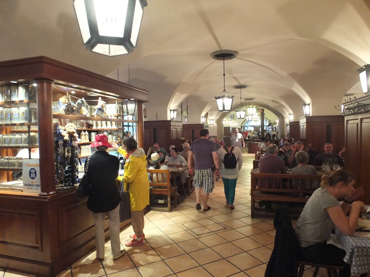 The biggest tourist attraction in Munich is arguably this location, the Hofbräuhaus. This is a famous beer hall, one that stretches across three floors and can accomodate several hundreds guests at once. The Hofbräuhaus was originally built by one of the dukes of Bavaria in the late 16th century, and it was first opened to the public in 1828. Whenever one sees pictures of the Oktoberfest celebrations, the Hofbräuhaus is typically the backdrop for the carousing. Today, this is where all of the tourist buses inevitably make a stop, and the Hofbräuhaus is happy to lean into this role by dressing all of its employees in traditional German garb while playing various Bavarian folk tunes. There were doing great business even on a rainy weekday afternoon, and there were several gift shops next to the building selling Hofbräuhaus merchadise. I wasn't interested in eating or drinking at the moment, so I simply wandered through the restaurant taking pictures. Somewhat amazingly, no one stopped me or said anything as I walked right through the bottom two floors. Most people really do seem to assume that you know where you're going and that you belong there if you can manage to look the part. Up on the top floor was the traditional banquet hall, displaying faded banners on the walls and an enormous chandelier hanging from the ceiling. It was closed at the moment, and I managed to peek my camera inside to take a picture of the empty room. This would have been a great place to stop and relax if I'd had more time available.