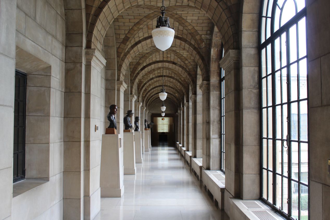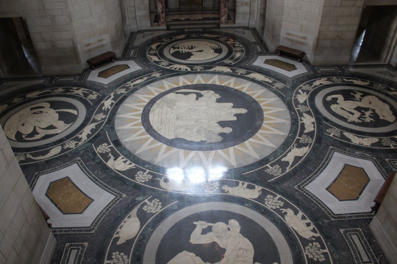 The interior of the Nebraska State Capitol was built like some kind of structure from the Roman Empire, with lots of columns and arches and mosaics in the floor. It also contained elements of a traditional cathedral, with the overall plan comprising a Greek cross enclosed by a 437-foot (133 m) square. The walls were built almost entirely out of unrelieved white limestone, and a huge central tower rises up out of the middle of this design. In addition to all of that, the building also incorporates some small, colorful designs based on Native American cultures tucked into odd corners and doorways. This whole place was wild and I couldn't stop taking pictures to try and capture what it was like. The best summary that I can come up with is to imagine a traditional cathedral built by a Roman emperor, while also somehow incorporating depictions of traditional American frontier life. What an eclectic mixture.