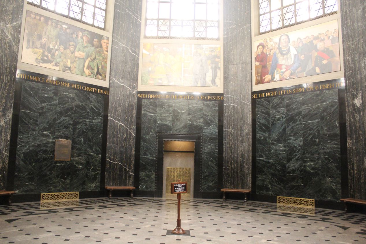 There was one more place to visit in the Nebraska State Capitol: the central tower. This was reachable by riding a cramped and old-fashioned elevator up to the 14th floor, where the structure opened up into a room directly beneath the top of the building. This room is known as the Memorial Chamber and it contains a series of eight murals depicting different hardships next to various ideals. For example, the murals pictured above include "The Perils of Fire" next to "The Ideal of Freedom" and depict individuals from different backgrounds in Nebraska, from military personnel to firefighters to Native Americans. A domed ceiling caps off the Memorial Chamber, with a statue of a man planting seeds named "The Sower" located on the other side of that dome at the top of the building. There was no exterior walkup up here that granted access to the outside, but it was still possible to see out the grated windows to get a view of the city of Lincoln. I was unable to spot much in the way of landmarks, and the views to the east and south held little more than the occasonal building popping up in an otherwise wooded area. The downtown portions of Lincoln were visible to the north and west though, and I could barely spot Memorial Stadium on the University of Nebraska grounds in the distance. That would be one of my remaining targets to visit before the day was finished.