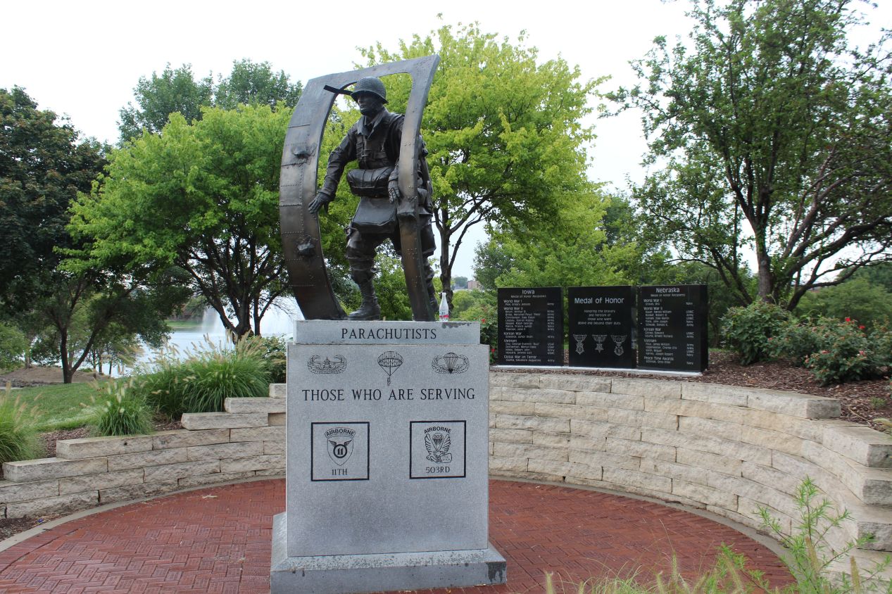 Heartland of America Park would have been lovely on a pretty day, but it felt a bit dreary on this cloudy and wet morning. The place was almost deserted aside from a handful of ducks that I spotted swimming in the lake. There were a number of different monuments here dedicated to war veterans, such as the pictured memorial to the Medal of Honor winners from Iowa and Nebraska. Another monument captured in bronze the spectacle of mortally wounded soldiers limping off into the sunset and the family members that they left behind at home. While these were finely crafted memorials, they certainly didn't do a whole lot to lighten the mood. I walked north from the park, under the interstate overpass, to Lewis and Clark Landing, an open space along the riverfront where the Lewis and Clark expedition first reached what would later become Nebraska in 1804. I should clarify that the river that separates Iowa from Nebraska is the mighty Missouri River, one of the longest in the world when combined together with the Mississippi and a river that runs through both Dakotas up to its source in western Montana. Trade along the Missouri River gave birth to the city of Omaha, and much of the riverfront land has been converted into modern parkland for recreational use.