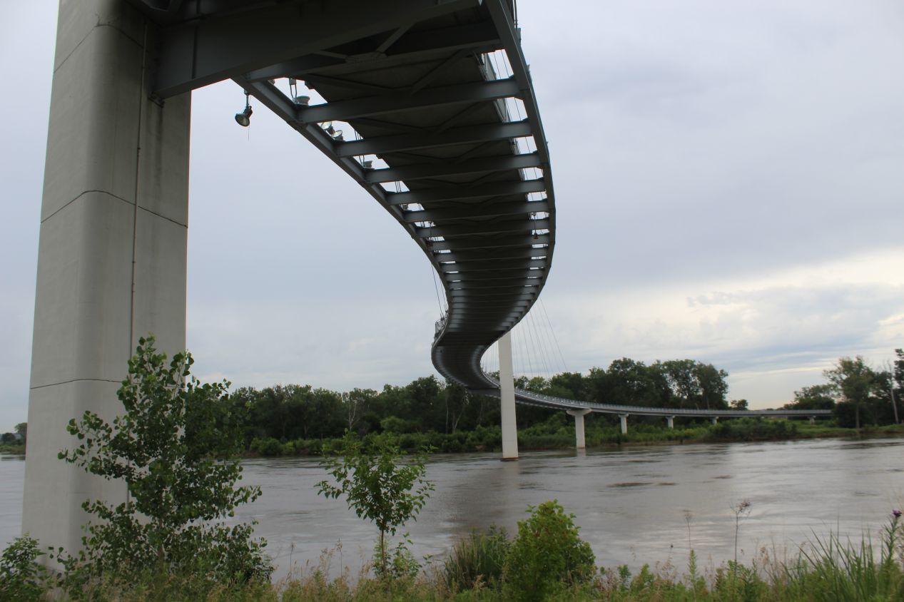 The most distinctive landmark in the area was this pedestrian bridge stretching across the Missouri. This is known as the Bob Kerry Pedestrian Bridge, and it was built in 2008 as a way to connect Omaha together more closely with Council Bluffs on the other side. The architectural design for the bridge had a delicate feel to it, between the two narrow pillars holding it up and the unnecessarily-curving undulations of the bridge path itself. The Lewis and Clark National Historic Trail Visitor Center is located right next to the bridge (which hadn't opened for the day yet when I arrived), and there were a bunch of little signs describing the local wildlife that could be spotted in the area. Despite the early hour and the overcast weather, there was a steady flow of pedestrians crossing the bridge when I visited, people out to exercise or running errands on foot. The top of the bridge was a great place to take in views of the surrounding area; if you look closely, you can even see the fountain from Heartland of America Park rising up in the distance behind the highway.