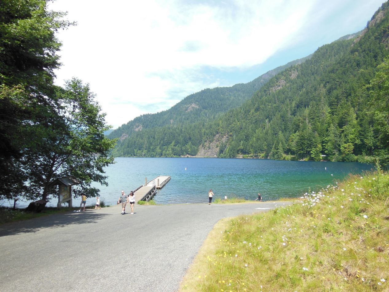 The Hoh rainforest ws only about 20 miles away from Hurricane Ridge by air, but getting there would require driving a little over 100 miles / 160 kilometers along the circuitous route around the boundaries of the park. Along the way, we stopped at the lake pictured above to stretch our legs and walk a bit. This was Lake Crescent, located just inside the northern edge of Olympic National Park, and easily accessible due to the road that runs alongside it. It was about as picturesque a body of water as I've ever seen, especially on a sunny summer day like this one. The lake was ringed by densely forested hills, and the water was a deep greenish-blue color. We could easily see down to the rocky bottom from the dock in the picture above; it was nice clear water, likely safe to drink although we didn't try. I especially liked seeing the man who was taking his dogs swimming. While it was a little on the cold side for people to go swimming, the dogs seemed to be having a blast!