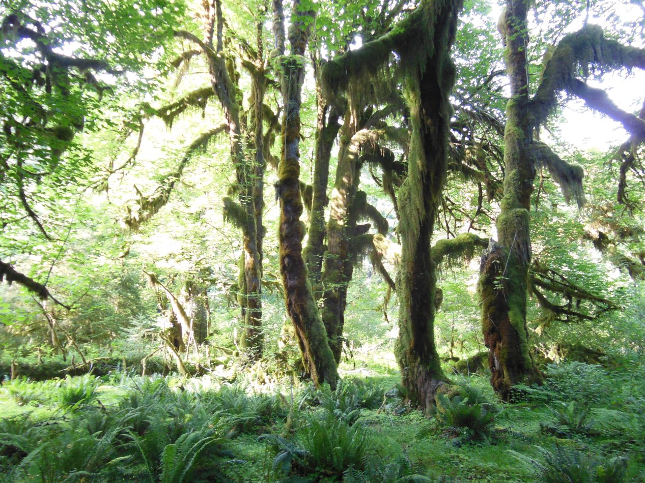 Eventually we reached the Hoh visitor's center in the afternoon. Located on the western slopes of the park, this region has one of the more unique climates that I've been fortunate enough to visit: a temperate rainforest. As the name suggests, this is an area that receives a massive amount of rainfall each year, but is located outside of the tropics where most of the world's rainforests can be found. The result is a unique ecosystem teeming with life that often can't be found anywhere else, and this was one of the biggest factors in setting aside land for the park as a natural preserve back in the 1930s. The Hoh visitor's center receives about 150 inches / 380 centimeters of rain annually, making it the wettest location in the continental United States. (There are parts of Hawaii that get significantly more rain; the island of Kauai actually gets TRIPLE this amount of rain each year.) The huge amounts of water falling as rain allows for the growth of enormous coniferous trees, different types of spruces and firs and hemlock trees. The constant moisture also leads to the growth of massive amounts of moss, and this is what the Hoh rainforest is best known for. The old fashioned phone booth provides a good example of how moss simply takes over any surface that isn't kept cleared of it. It grows on the trees and coats the forest floor in shaggy carpeting in a truly unique ecological phenomenon.
