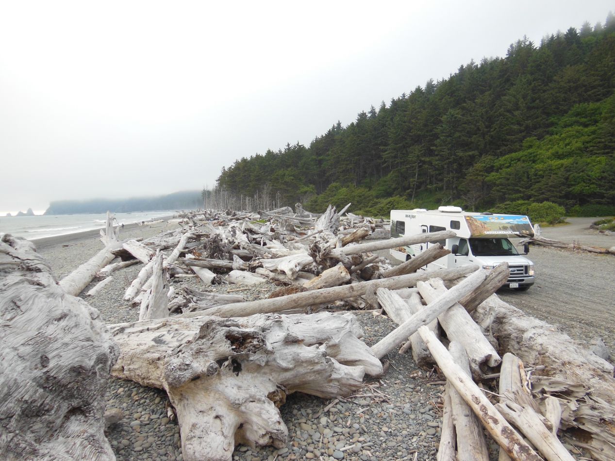 Rialto Beach was cold and windy. It was surprising how much the temperature and the climate had changed from the Hoh rainforest only a dozen or so miles away. It was probably about 20 degrees Fahrenheit cooler here than it had been back at the Hall of Mosses, and of course there was a steady breeze blowing in off of the ocean. It was late afternoon by this point and we likely could have seen the sun beginning to set over the water if the whole beach hadn't been shrouded in a dense layer of fog. That particular bit of weather had obviously been caused by the ocean, as there was no such fog only a mile or two inland. The beach itself was rocky and there was a lot of driftwood that had piled up over time along the shore. Several kids were playing in the water a little ways down, but it was too cold for anyone else to venture into the ocean.
