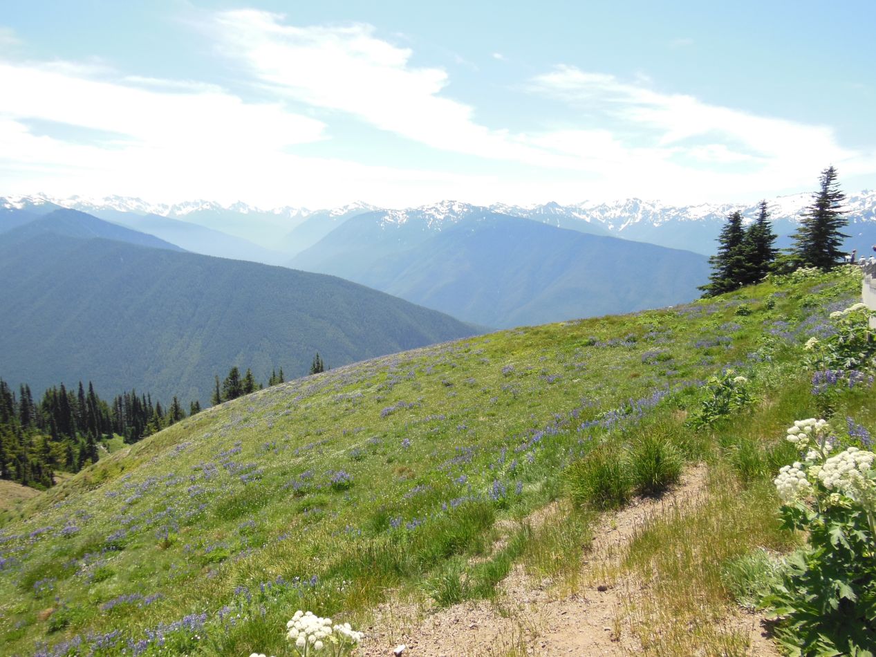 The only word that I can use to describe the views at the top is "stunning". The views on the way up to the top of Hurricane Ridge had mostly been obscured by surrounding tree cover as the car ascended. Up here at the top though, we could suddenly see far off into the distance at the surrounding snow-capped peaks. The visitor's center was located just barely above the tree line, but not so high that the ground turned into a bare rock surface. Instead, the landscape was made up of tough grasses and beautiful small flowers, a series of alpine meadows that allowed visitors to see miles and miles into the distance. These pictures were taken looking to the south into the heart of the park, and it was all wilderness out there, no roads at all. Just a few hiking trails that headed deep enough into the park that they typically require multiple days to complete, with an overnight stay or two along the way. It was an incredible display of natural beauty in a remote part of the state.