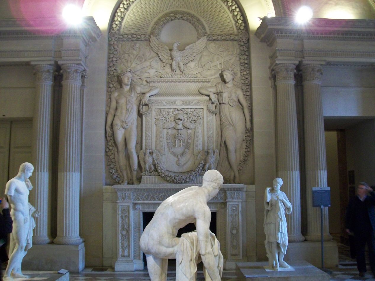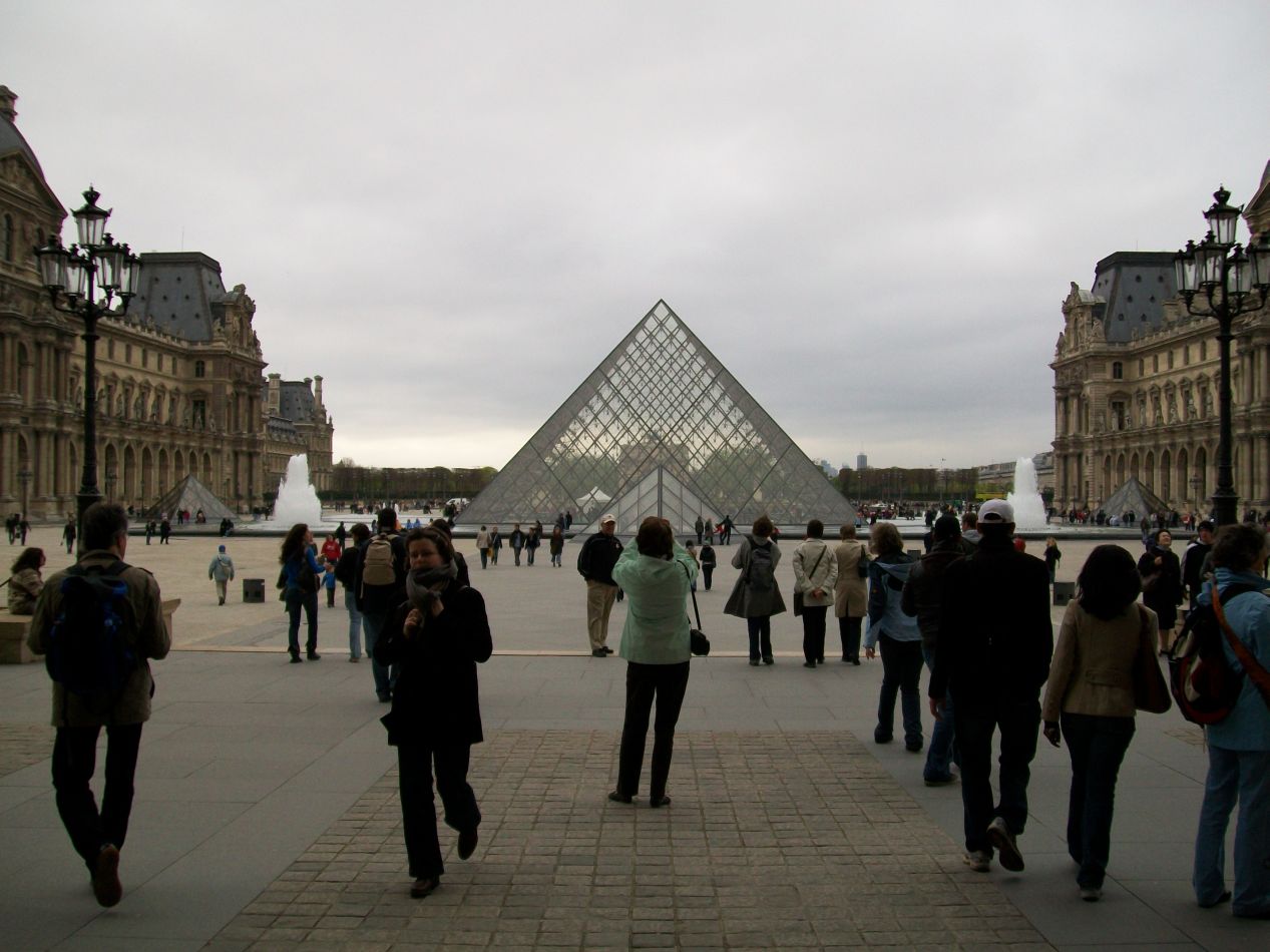 After stopping to get lunch, we headed to the Louvre for the afternoon. The Louvre is the world's largest art museum, situated in the former royal palace of France's kings, and it also draws more visitors than any other art museum at more than 10 million per year. The oldest portions of the Louvre date back to the 12th century when it was first constructed by Philip II; at that early date, the Louvre was a defensive fortification intended to protect the city of Paris from raiding Norman knights. The remnants of this initial castle can still be seen in the basement of the Louvre, and I included one such picture from that area above. The Louvre was greatly expanded again and again over the following centuries, eventually becoming a gigantic palace no longer intended for military defense and instead used for the pleasures of the French monarchs. After the French Revolution, the Louvre was converted into a public art museum and it remained such throughout the turbulent political changes of the 19th and 20th centuries. The Louvre continues to change even in the current era, most notably with the addition of the glass pyramid in 1989. The pyramid was highly controversial at the time but has become more generally accepted in the decades since it was first created. The glass pyramid is actually the main entrance into the Louvre complex; visitors walk through its doors and then descend down into an underground lobby where tickets can be purchased. The lines were fortunately not too long since we were arriving in the afternoon of a rainy day in spring.