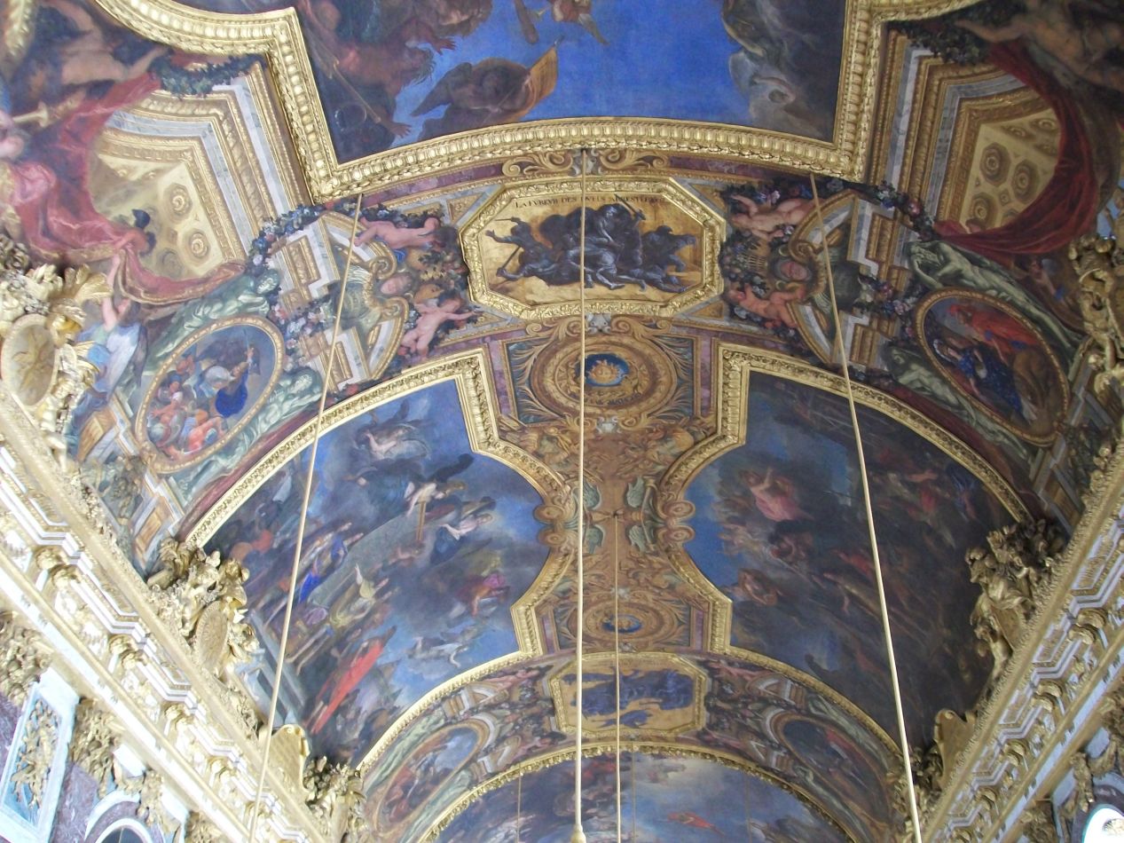 The centerpiece of Versailles is the long hallway known as the Galerie des Glaces, or Hall of Mirrors in English. This hall was used for banquets or other state functions by the French kings, and was designed around a series of arches that each contained 21 mirrors. Clear glass was difficult to produce in the 17th century and mirrors were a sign a wealth due to their high cost, making this hallway an extravagent statement of the power and wealth of the French monarchy. This same message is reflected in the motto engraved into the ceiling's central panel: Le roi gouverne par lui-même ("The king governs alone"). Louis XIV sounds like he would have been a lot of fun to hang out with, doesn't he?