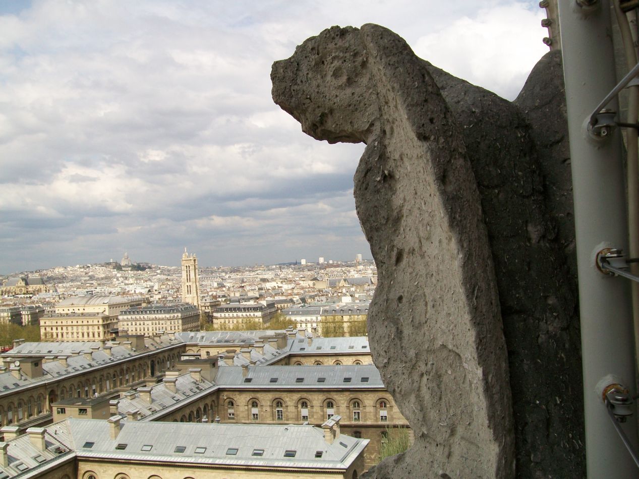 The highlight of this tour was the gargoyles located along the sides of the cathedral's roof. The gargoyles of Notre Dame have become famous enough to appear in many different works of popular culture, with perhaps the best example taking place in the Disney animated version of the Hunchback of Notre Dame from the 1990s. The monstrous shapes of these stone figures were part of the visual storybook created by medieval cathedrals, symbols of the evil and the danger that threatened those who did not follow the teachings of the church. In other words, they were part of the same narrative as the stone figures of saints and other Biblical figures, passing along a religious message to a population that was almost completely illiterate. The gargoyles at Notre Dame also had a secondary function: they served as the rainspouts for the cathedral, and still drain the water that runs off the roof to this day. A close inspection of the gargoyles that projected out from the walls revealed clear channels for rainwater to run through, making them both fanciful and functional at the same time.