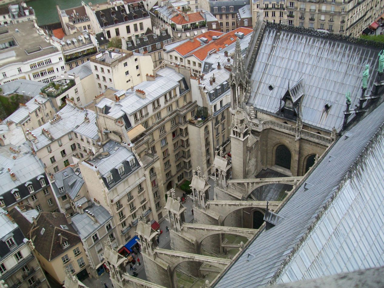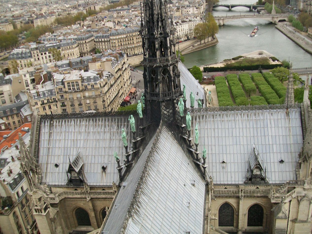The rooftop tour of the cathedral also took visitors into the bell tower of Notre Dame, the place where the mythical Quasimodo supposedly rang the giant bells each day. There are almost two dozen of these bells in total, with the largest one (named Emmanuel) weighing 13 tons and dating back to the medieval period. Most of the others were destroyed in the French Revolution and have been replaced with modern versions. The belltower had an entirely wooden interior and was highly interesting to visit, but unfortunately it was too dark inside for any of my pictures to turn out clearly on this cheap digital camera. The tour also provided views of the cathedral's rooftop and spire, and these are unfortunately parts of Notre Dame that can't be viewed any longer. A massive fire broke out in the cathedral on 15 April 2019, almost exactly ten years to the day after these pictures were taken, and the roof and spire were both completely destroyed. Everyone was terrified that the whole cathedral would be lost, but fortunately the exterior walls held up and the damage was limited to the roof. The copper statues on the spire had even been removed before the fire as part of a renovation project and were also safely preserved. Reconstruction is underway as I write this report and it won't be long before Notre Dame is restored back to its former glory once again. I am exceedingly glad that the world did not lose this priceless treasure.
