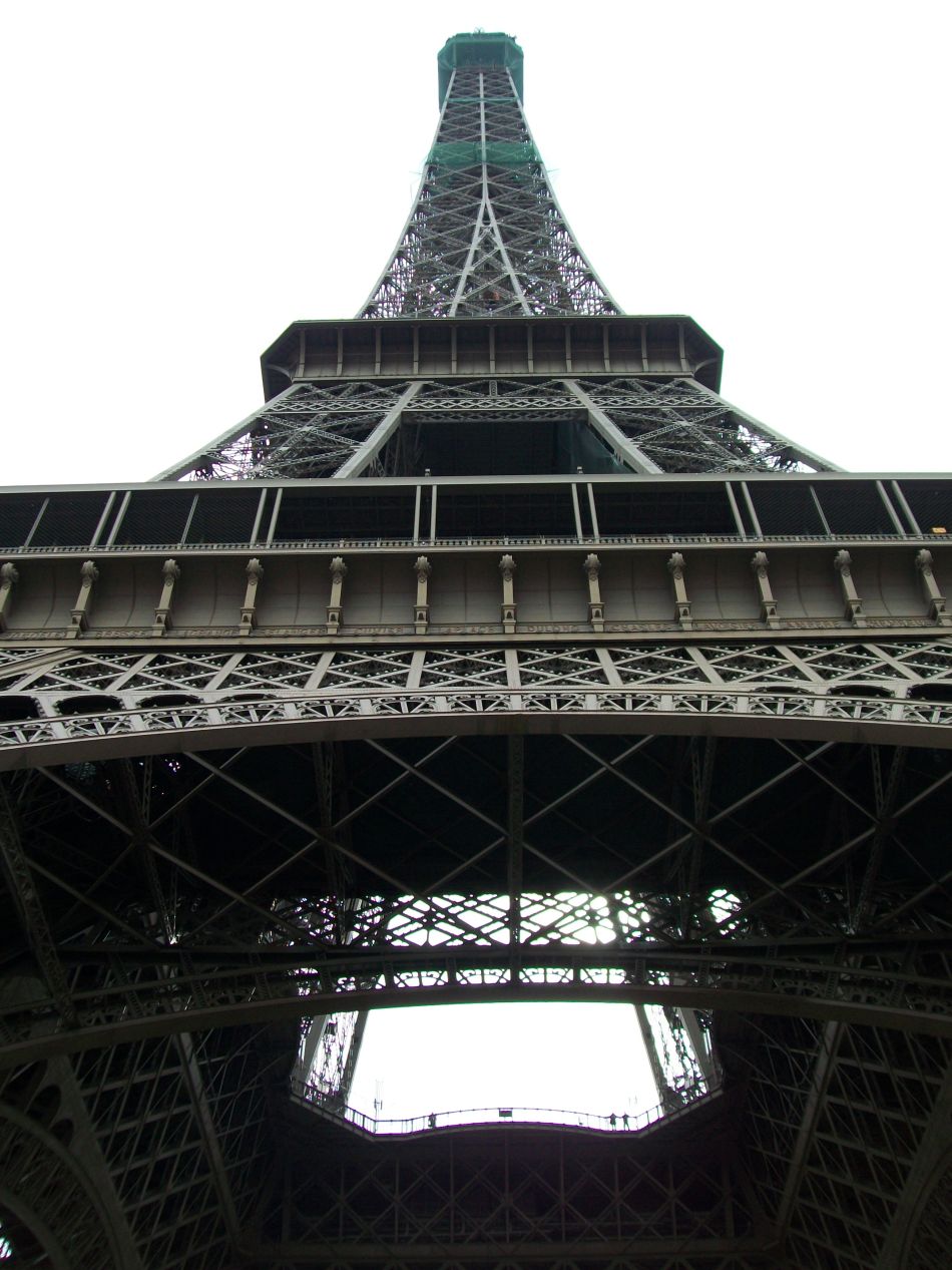 The next morning dawned under cloudy skies, nowhere near as nice as the previous day but fortunately not raining. We decided to start the morning by visiting the Eiffel Tower, the most famous landmark in the city of Paris. Designed and named after French engineer Gustave Eiffel, the tower was originally built for use at the 1889 World's Fair and intended to be a temporary exhibit, only to prove popular enough (and useful enough as a radio and television broadcasting tower) that it became a permanent part of the city. It's always felt a bit strange to me that the Eiffel Tower became the internationally renowned symbol of Paris rather than the Louvre or Notre Dame or the Arc de Triomphe, and it's fairly low on my list of favorite attractions in the city. Nevertheless, visiting the Eiffel Tower is a mandatory part of any trip to Paris and we headed there early in the day before it became too crowded. Near the iron structure, the color of the Eiffel Tower is revealed to be different shades of brown rather than the black that it can appear at a distance. We rode up to the second visitor level on the cable cars attached to the tower, which actually run up the sides of its legs and present a dizzying view while traveling upwards. The entire Eiffel Tower is a gigantic form of interconnected iron lattices, and it can be discomforting to realize you can see right through the thing while standing hundreds of feet in the air.