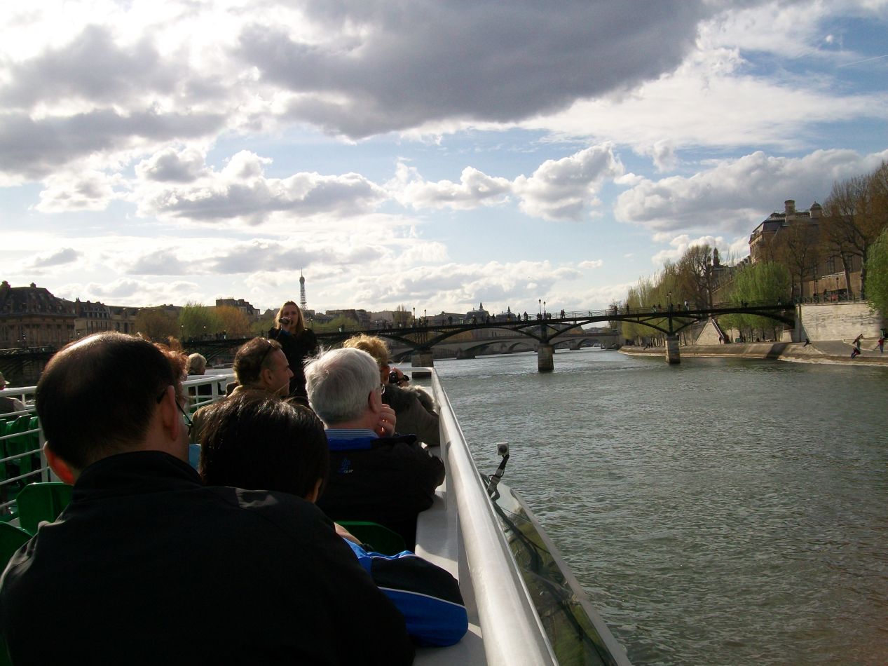 After stopping to eat lunch, we took a boat tour on the Seine to get another perspective on the city's attractions. The boat left from the western edge of the Île de la Cité, the island at the center of the city, and traveled first to the west downriver for several miles. We passed underneath a series of famed bridges, everything from the Pont des Arts to the Pont Neuf (the "New Bridge", paradoxically the oldest bridge in the city). We also passed by the Eiffel Tower again, and unfortunately the pictures that I took of the tower came out highly blurry. This was a good vantage point to see the walking paths that run alongside the river, home to vendors that sell artwork and books to passers-by. The weather was even starting to clear up and it had turned into a rather nice day.