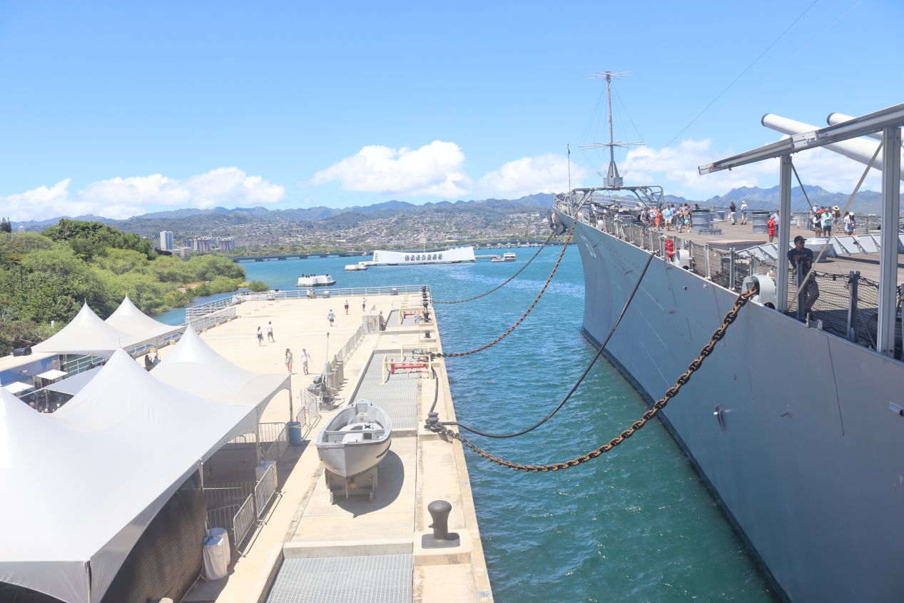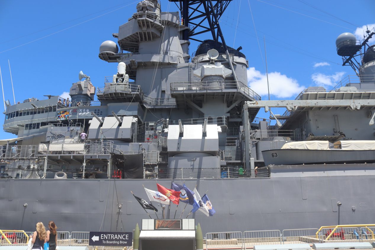We had one more attraction to visit before departing Pearl Harbor for the day, the nearby USS Missouri Museum. This battleship is also located on Ford Island and reached via the same shuttle bus service used by the aviation museum; the shuttle bus actually stops initially at the USS Missouri so we had to go back to the visitors center and get on a second bus to make our way over to the humongous battleship. The Missouri was impossible to miss as it towered over everything in its vicinity, standing an eternal watch over the USS Arizona Memorial several hundred feet away in the direction of its bow. Before we boarded the ship itself, I walked down to the end of the pier where it was docked to capture the size of the Missouri as it stretched away into the distance. The Missouri had an official length of 887 feet / 270 meters and held just shy of 2000 navy personnel when it was fully complemented. This was the last battleship ever commissioned by the United States and it saw action during World War II and the Korean War, if not the ship-to-ship action for which it was originally intended. (Battleships were mostly used for shelling ground targets after it was discovered that carrier-based aircraft were more useful than big-gun battleships for pretty much everything.)