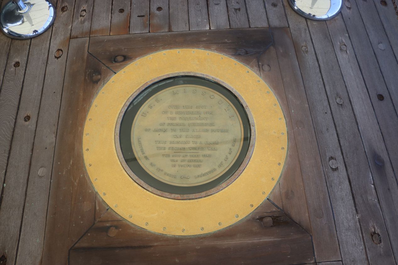 The Missouri is most famous for serving as the location of the formal Japanese surrender at the end of World War II. The ceremony took place on a raised portion of the main deck and there are several signs along with a roped off marker to indicate where the treaty signing took place. The Missouri was located in Tokyo Bay at the time and the short ceremony occurred during the morning of 2 September 1945. There's a replica version of the signed treaty on display at the Missouri which amusingly preserves the error made by the Canadian representative who signed on the wrong line and forced everyone else below him to cross out the printed text and hastily scrawl in the corrected names. I can only imagine his embarassment: imagine being present at a historic ceremony like this and then accidentally signing your name in the wrong place!