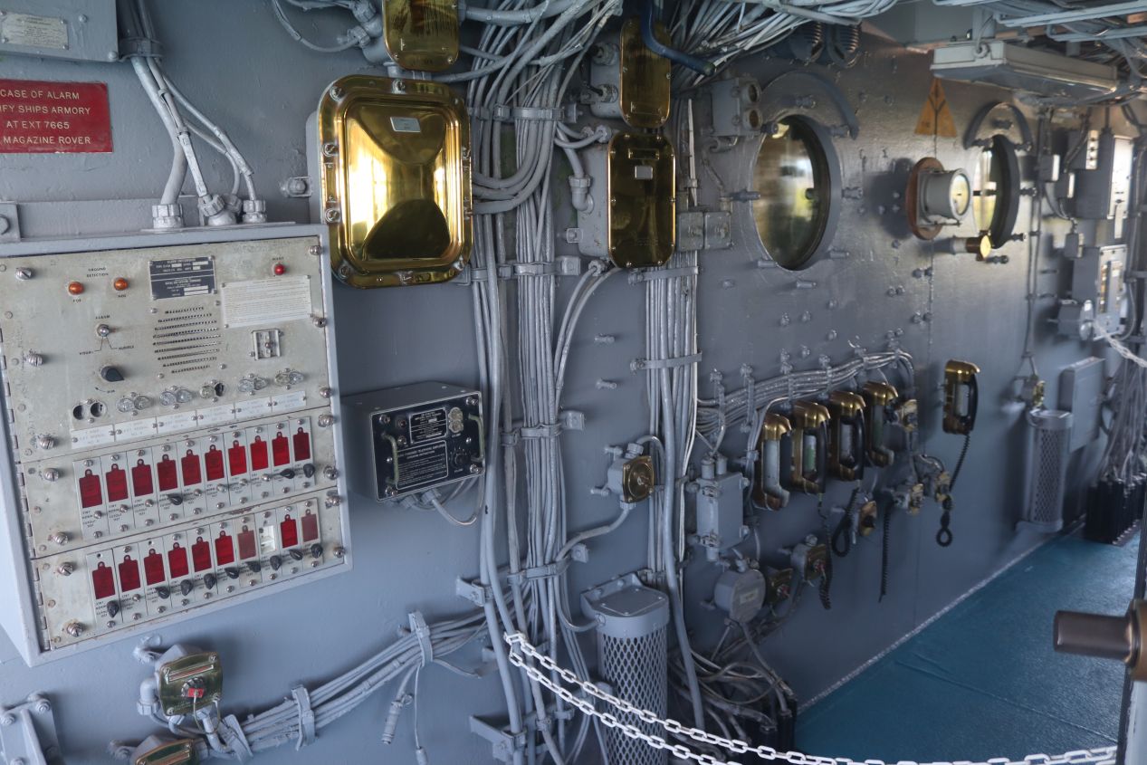 We were able to tour the bridge of the Missouri which involved climbing a series of steep ladders up to the command and control portion of the vessel. I was surprised to find that the actual helm of the ship where the steering wheel was located (captured in the first picture above) did not have any direct view of the ship's exterior. This was deliberately done to encase the helm with as much thick armor as possible for protection against incoming shells. The actual steering required constant communication with other parts of the bridge that had an unobstructed view and coordinating with the ship's radar systems for safety. As expected for a ship built in the pre-computers age, there were big metal switches and dials and knobs everywhere that must have had all sorts of mechanical functions. Afterwards we walked back to the stern of the ship which held the third main gun turret along with an open part of the deck that had been converted into an outdoor seating area with a podium for giving speeches. This was the part of the Missouri where a kamikaze attack hit the hull in April 1945 but failed to punch through the armored plating. There was a small placard commemorating the event and a note that the crew held a ceremony for the enemy pilot in recognition of his bravery.