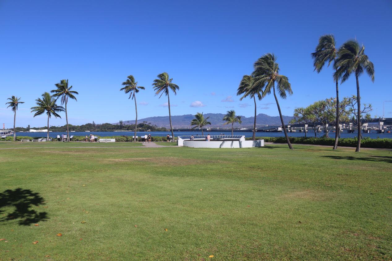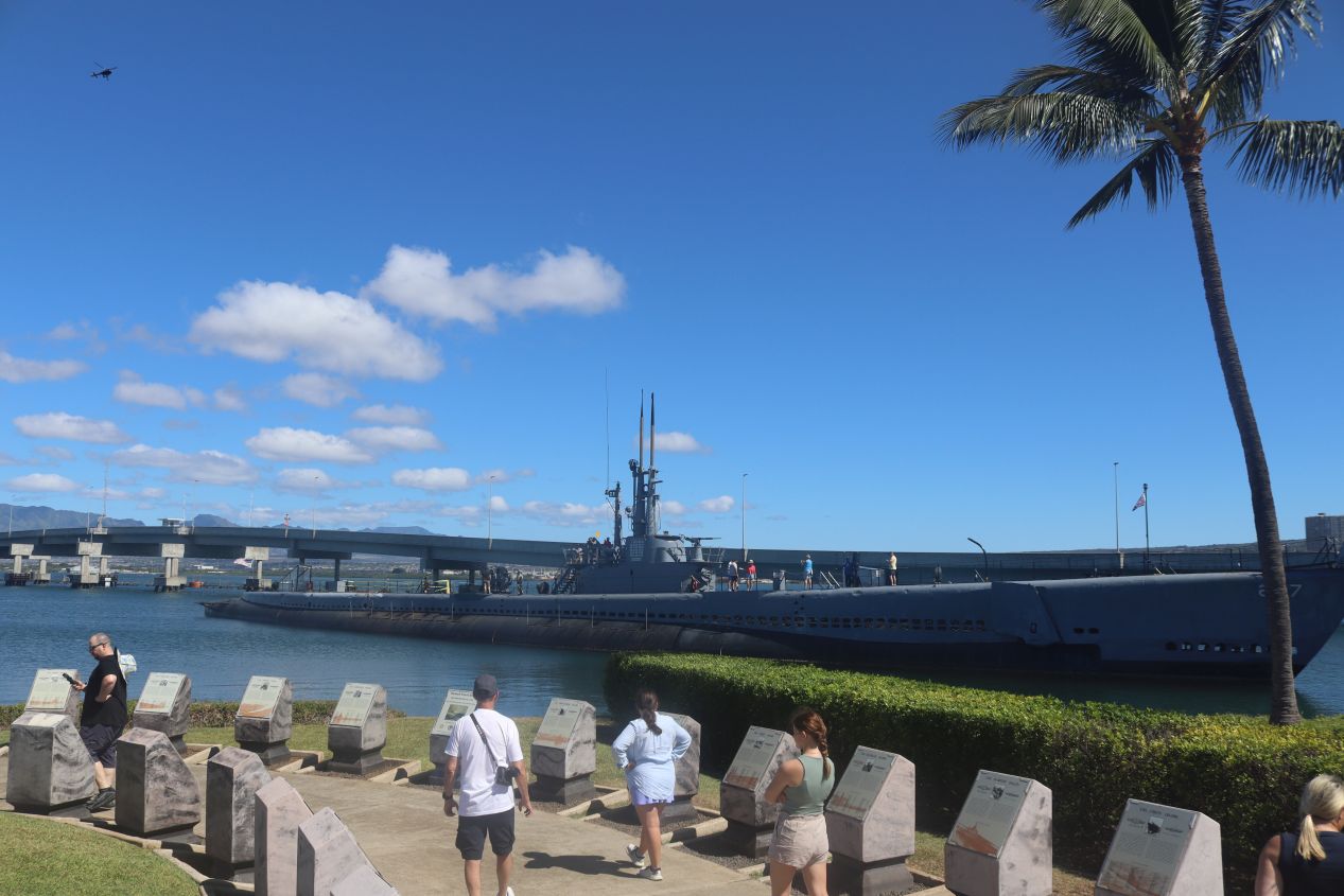 Pearl Harbor National Memorial is located a little bit to the north of the main naval base where there's a clear view across the harbor to tiny Ford Island in the middle of the water. That was where all of the battleships comprising the core of the United States Pacific Fleet were docked at the time of the Japanese attack, lined up neatly in rows where they were easy targets for dive bombers. For modern-day visitors to Pearl Harbor, the biggest attraction is the memorial constructed atop the sunken remains of the USS Arizona which we would be experiencing as soon as we could get to the front of the standby line. There's also the USS Missouri to visit, a World War II era battleship that wasn't destroyed in the attack, along with the Pearl Harbor Aviation Museum and the submarine named the USS Bowfin. We'd be visiting everything except the submarine so I tried to capture a few pictures of the Bowfin as I strolled around the visitor grounds. The US military had done a wonderful job of putting together these memorials which are solemn reminders of the people who died here situated in one of the most beautiful locations I've ever visited.