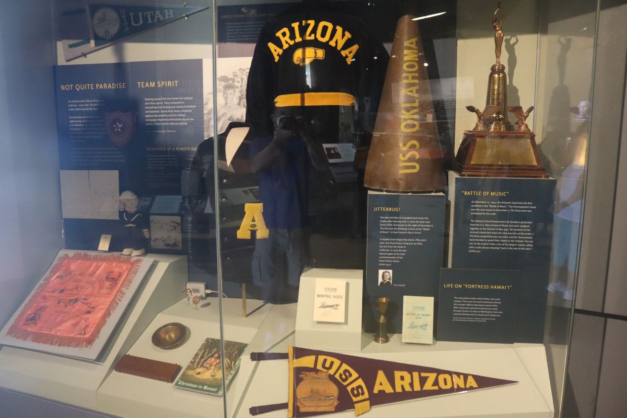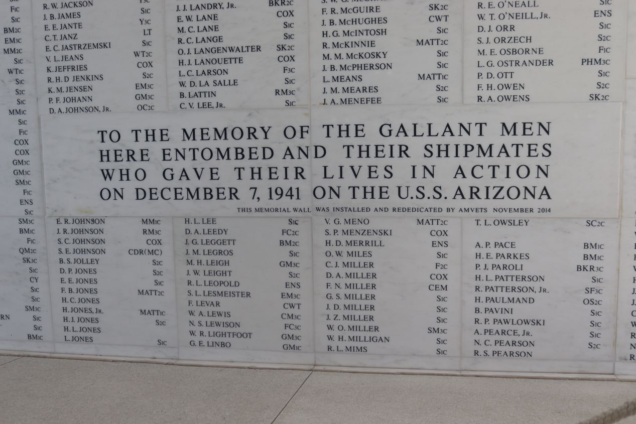 The back end of the memorial holds the shrine room listing the names of the 1177 sailors and marines who were killed when the Arizona sank during the Japanese attack. One of the bombs hit the forward magazines and immediately triggered a cataclysmic explosion that tore the ship apart and killed nearly 80% of its crewmembers. While the other battleships sunk at Pearl Harbor were eventually repaired and returned to service, the Arizona was too badly damaged to be recovered and thus it has remained in this spot ever since, deliberately left as a memorial to commemorate the deceased. We learned here that survivors of the attack on the Arizona have the option to place their final remains here after they die and several dozen have done so, with their names added to a separate smaller plaque at the memorial. This is considered to be an active military cemetery and everyone was treating it with appropriate respect on our visit.
