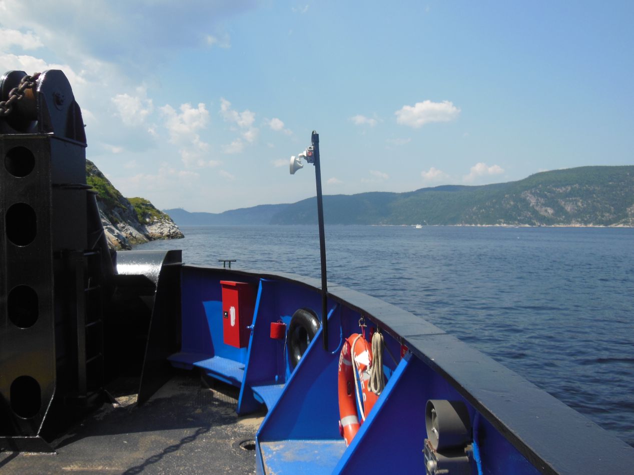 After more backtracking on the road, I made it around to the eastern edge of the fjord. There's an interesting phenomenon here: highway 138 simply stops at the mouth of the Saguenay River and picks back up again on the other side. A ferry service takes cars across the intervening waterway, and even better, there was no fee to make the trip. I didn't have to wait very long before I drove my car onto the ferry and then took the five minute trip across to the other side. Up close, the water was a very dark blue and cold to the touch.