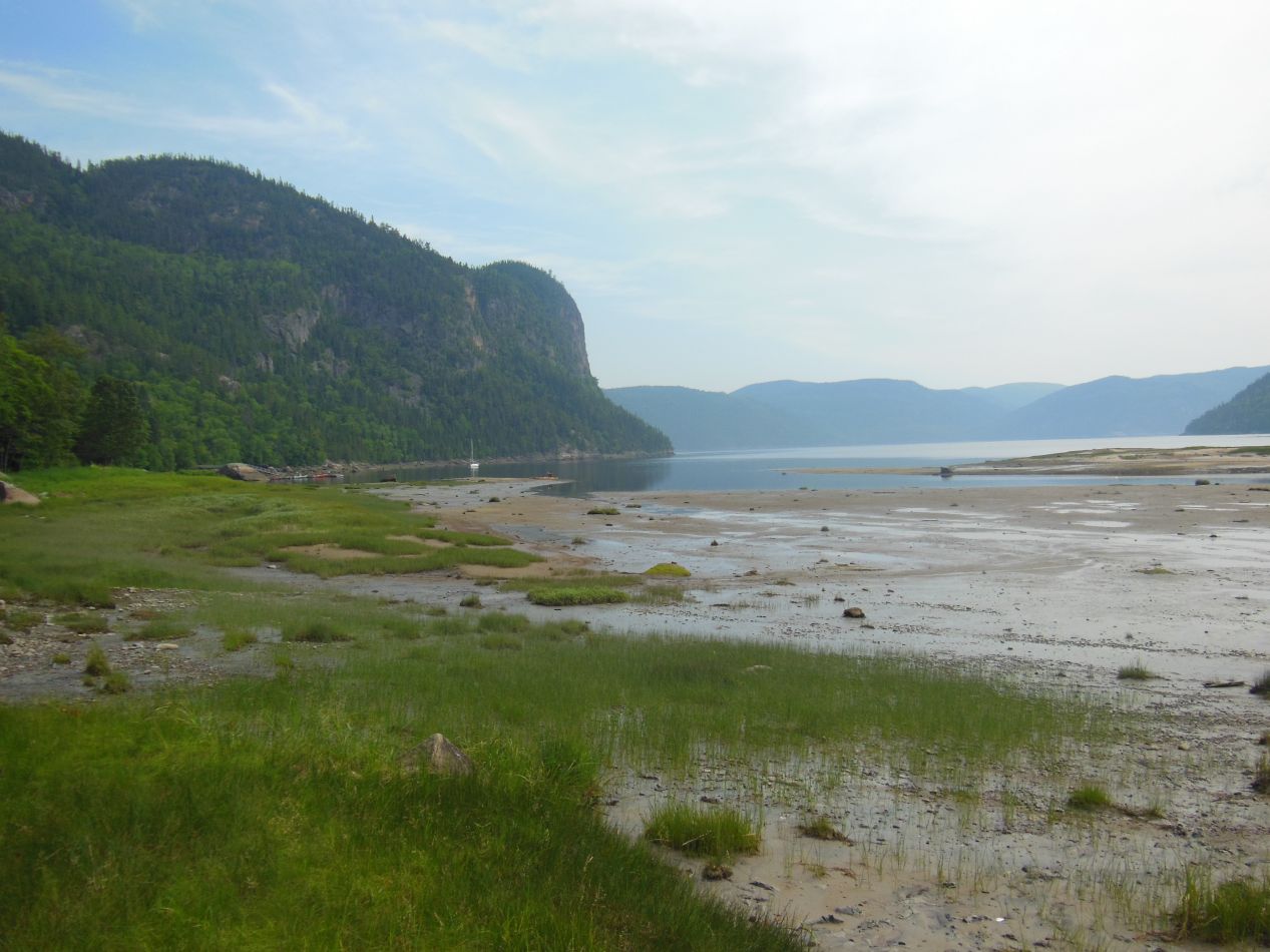 I arrived at Saguenay Park in midmorning. After parking my car in the mostly empty lot, I headed off to explore the nearby trail. The sign above showed that I was in the right place, and the distance to the statue was only 3.5 km (a little over 2 miles). However, the sign indicated that the path was "difficile" and that proved to be correct, as I would discover that the hiking trail was quite steep. In the meantime, I was able to see views of the southern end of Eternity Bay, and the sights didn't live up to the elegant name attached to them. It turned out that I had arrived here at low tide, and like the Bay of Fundy that I had visited a few years earlier, Saguenay Fjord has some of the most dramatic tides in the world. It's not unusual for the water to level to change by 10-15 feet between high and low tide in this area. I was seeing the mud flats exposed by low tide at the moment, and they weren't particularly attractive.