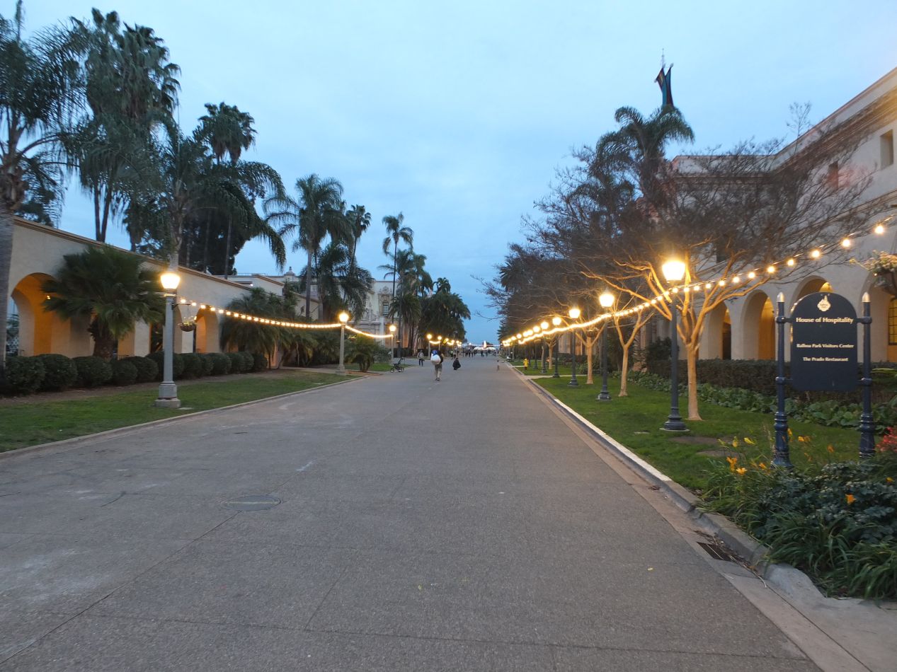 A continued walk through Balboa Park led me to the featured area in its center, the cluster of buildings known as the California Quadrangle. This was the center of the California-Panama Exhibition held in the early 20th century, and the buildings were afterwards turned into museums and art institutes for the city of San Diego. The Spanish Colonial style of architecture was on full display here, and the central Plaza de Panama where I snapped these pictures looked like it could have been lifted out of Mexico City. It was early evening by this point and strands of lights had been turned on throughout the park, lending a merry yellow glow to these images. It made me wish that I could come back here during the day and explore some of the museums, which ranged from the San Diego Museum of Art to the Museum of Man to multiple different historic theatres.