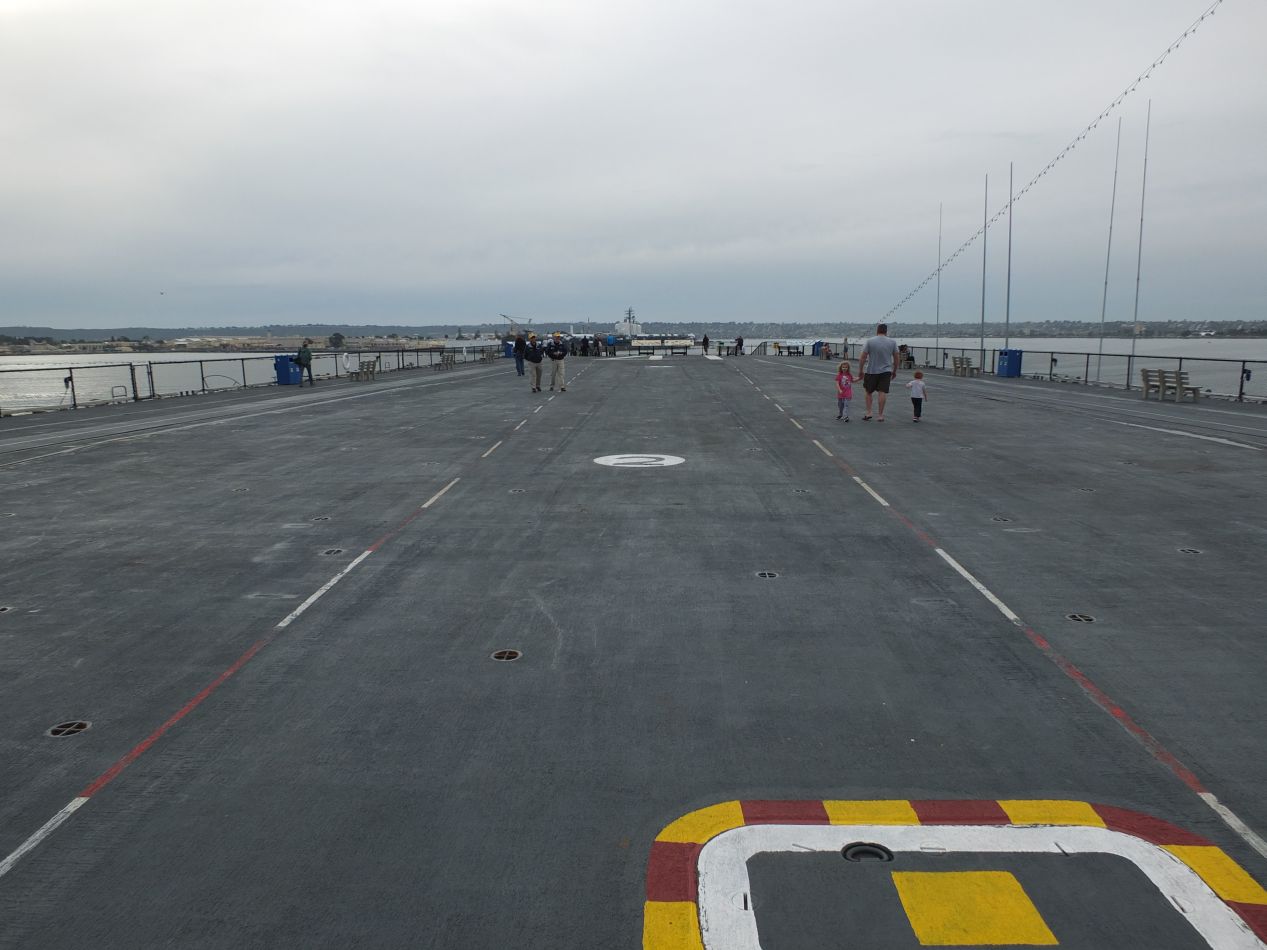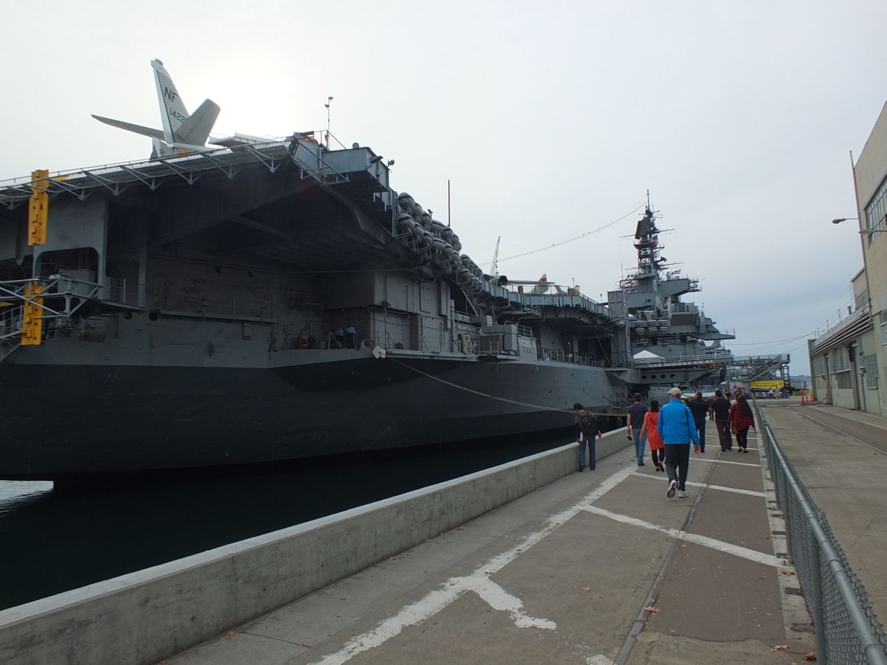 The first major attraction that I visited on the day was the USS Midway, an aircraft carrier that has been turned into a museum. The Midway was commissioned in 1945 shortly following the end of World War II, and it took part in every American armed conflict that followed up through the first Gulf War, before finally being decomissioned from active service in 1992. My initial impression while walking up to the carrier was simply to be struck by its enormous size. The Midway stretches for 1000 feet (300 meters) in length from bow to stern, while standing roughly as tall as a ten story building. It dwarfed the cars parked in the lot next to it, making them look like a child's set of toys. This was the largest ship in the world when it was first built and held that record from 1945-1955; yes, this is one of the many modern ships to be larger than the famous Titanic. I purchased an entrance ticket and spent the next hour exploring the decks of the warship.