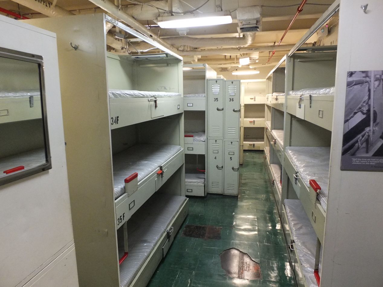 Much of the space on the carrier was taken up with living quarters for the crew, and the tour guided visitors through a sample of these areas. The first two pictures were taken from an area where the enlisted men (i.e. the rank and file sailors) were quartered, and these bunks were spartan to say the least. Each sailor was entitled to only six cubic feet of space in what the informational signs described as a "coffin locker". There was basically enough room to sleep and keep a very small number of personal items, and that was it. This couldn't have been very pleasant for the enlisted men and women, especially if the Midway happened to be traveling through rough seas at the time. The third picture was taken from an area holding the officers quarters, and they were considerably nicer, with much more room to sleep and some actual storage space for personal belongings. I liked the display of the tiny little library, although that may or may not have actually held books when the ship was in service. A little over 4000 people were stationed on the carrier when it was on active duty, crammed into these quarters like sardines. I tried to capture the narrow hallways and low ceilings that characterized living spaces on the Midway. Space is always at a premium on any seagoing vessel, even one as large as this.