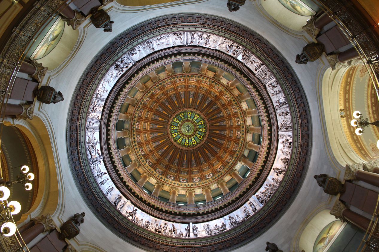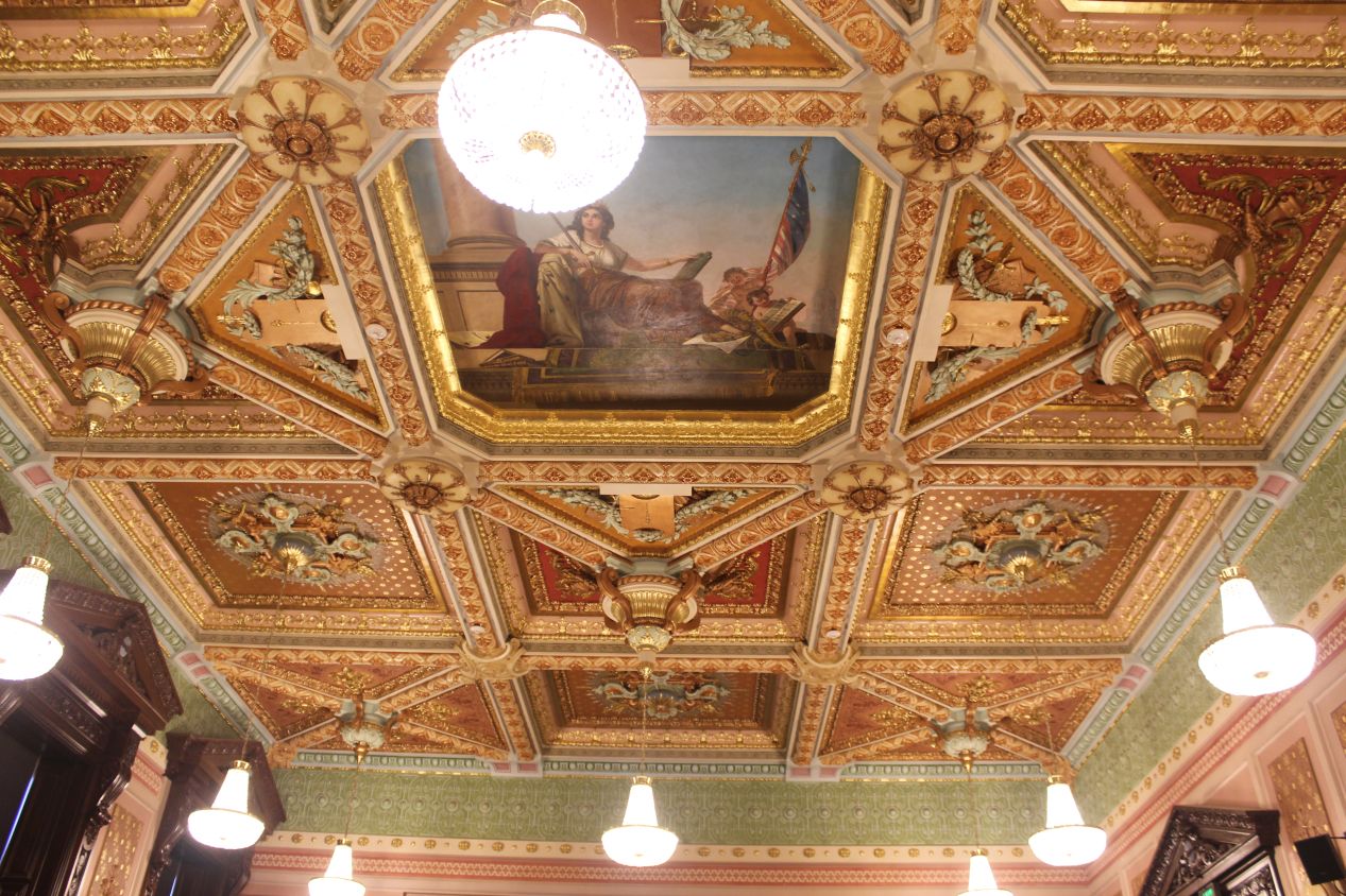 These pictures were mostly taken from the room housing the Illinois Supreme Court, which now meets in a far larger and fancier room than the one in the Old State Capitol. Illinois uses a setup with seven justices on the supreme court, although there were clearly far more than seven chairs behind the bench when I visited. I'm not sure what was going on with that setup. There were additional marble columns in the rear of the room to go along with the wood paneling, and a lavishly decorated ceiling that could have come out of a French chateau. That is, aside from the 19th century depiction of Columbia with an American flag as the centerpiece, which is a reference that no one uses any more. This was also the floor where the governor's office was located, although it was not open for visitors and I didn't see anything aside from a closed door with "governor" on the front. I also included another picture of the enormous central dome to get a look at some of the carvings that ran along its sides. I would have liked to get up to that upper walkway but that was only possible on guided tours, which I had missed out on. The view looking down from there must be incredible.