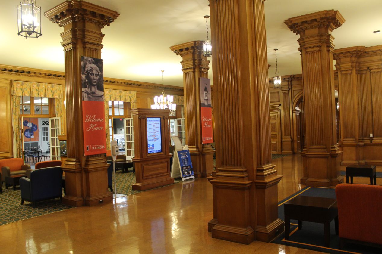 As I continued heading to the south, I came across this stately-looking building. This was the Illini Union, built in the 1940s on the site of the original university hall to serve as a home for student organizations and student activities. The doors were open when I arrived and the interior was surprisingly upscale, with wood paneling decorating the walls and chandeliers hanging from the ceilings. There were large fireplaces at the end of the entry hall that would presumably be lit during the cold winters in central Illinois. It turns out that the Illini Union is also an expensive hotel that caters to prestigious guests of the university. This impression was spoiled somewhat by the college-age student sleeping on one of the fancy-looking couches. Downstairs was also another matter, where the hotel atmosphere gave way to the typical accoutrements of a student union, with fast food restaurants, cafeteria-style seating, an arcade, and a bowling alley. Nonetheless, this was one of the more unusual student union buildings that I've seen due to the presence of that hotel. I didn't expect to find anything quite so chic on the Illinois campus.