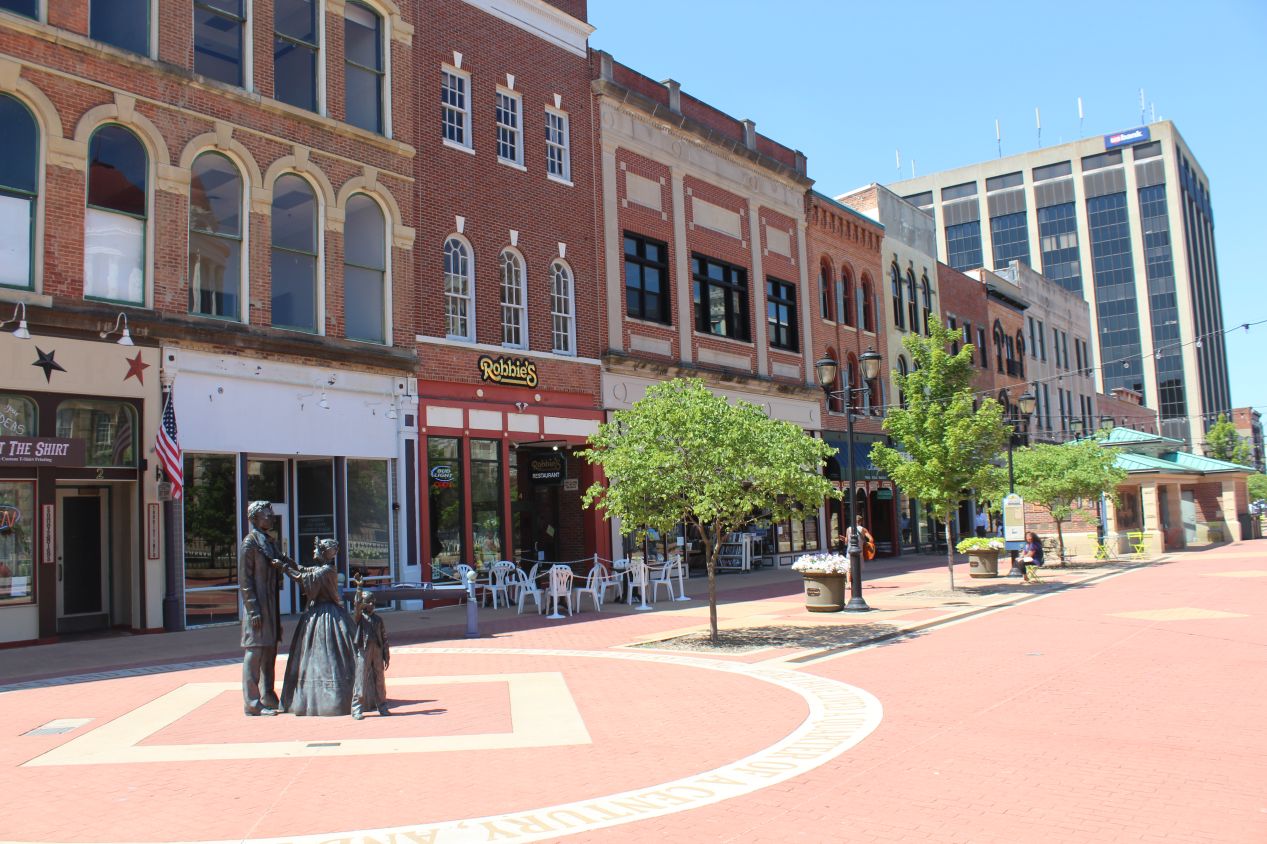 After finishing the tour of the Lincoln Home, I walked towards the historic center of Springfield where the Old State Capitol building was located. The small city was showing its best face today, with a series of walkable streets running between historic brick buildings under a cloudless blue sky. There was a blend of old and new here, with modern storefronts and small cafes located on the ground floor of these buildings while the structures themselves often looked like they were more than a century old. I passed by the location of Lincoln's law practice along the way, which was only about three blocks from his house. The office itself was not open, and it's unclear to me what this building is being used for at the moment.