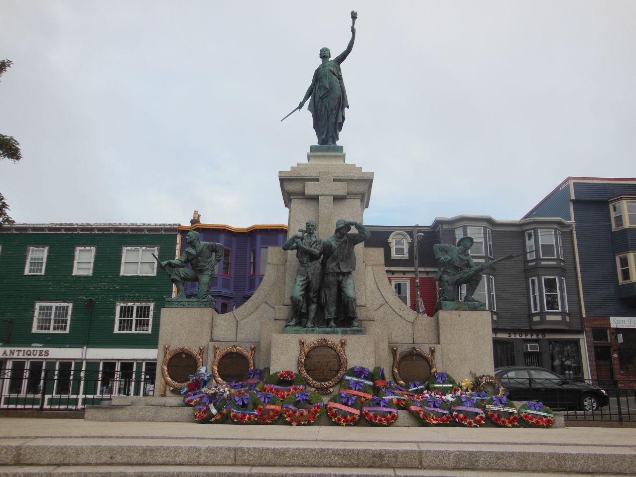 I started out by heading down to the harbor, where I visited a small green space known as Harborside Park. There was a monument here to the Royal Newfoundland Regiment and to the veterans of overseas Canadian wars, with a dozen fresh wreaths placed at the foot of the monument. They looked like they had been recently added, perhaps for the Canada Day celebrations about ten days earlier. The park was completely empty at the moment, likely because this was about 7:00 AM on a Saturday morning, and I was able to stroll around the waterfront and capture some more pictures of the harbor. In one of the pictures above, you can just see Cabot Tower on the top of Signal Hill off in the distance. There were also two life-sized statues of the dog breeds associated with this province, the Newfoundland and the Labrador. I understand that these are highly popular with visitors, and I made sure to take a few pictures for myself. Newfies and labs are both wonderful breeds of dog.
