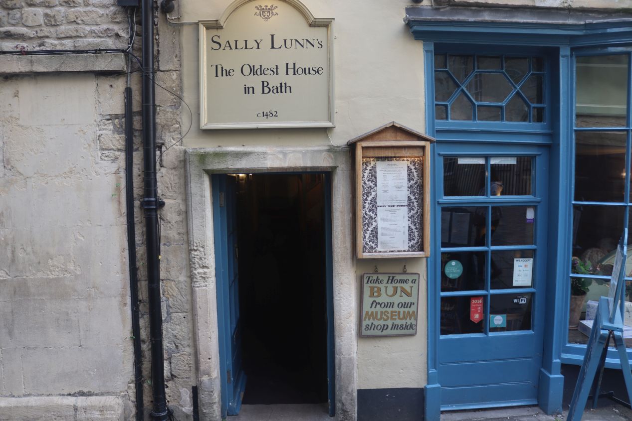 It was time for dinner by this point and we decided to stop to eat at a unique restaurant a few blocks away. This was Sally Lunn's restaurant, advertised as the oldest in Bath and with the building dating back to circa 1482. This probably wasn't a restaurant dating quite that far back but records do show that people were definitely eating here in the 18th century and Sally Lunn's has mostly kept its menu unchanged for the past three centuries. This restaurant lays claim to being the origin of the Sally Lunn bunn (which is probably an exaggeration), a toasted bun that can be served in either sweet or savory fashion. For the dinner menu, we were offered various different dishes known as "trenchers" where entrees were served on top of toasted bread. This was apparently a common way to serve food before plates came into common use (though of course our trenchers were served on top of plates!) We both had a trencher and the meal was quite good, certainly enhanced by the historic dining room and the restaurant staff wearing period costumes. We were lucky to be visiting on a nondescript Monday evening when we were able to get a table without having to wait or make a reservation. We would definitely recommend getting a meal at Sally Lunn's, as it was a unique experience and reasonably priced to boot.