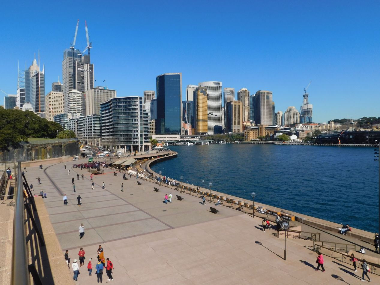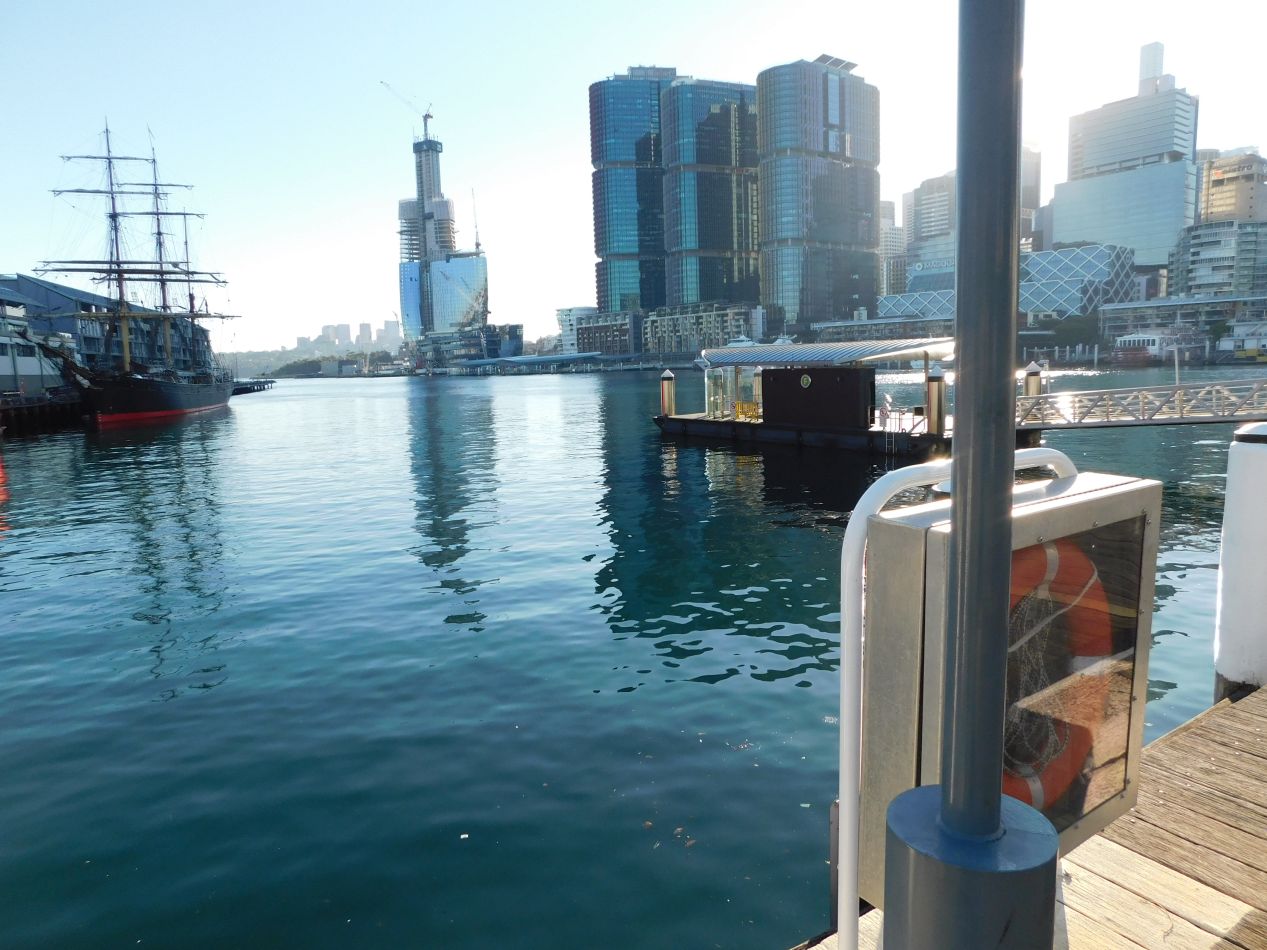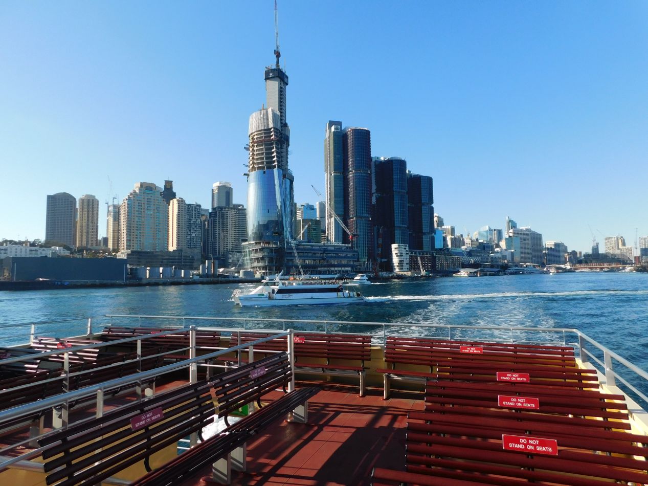 We had landed in Sydney much later than expected at about 9:30 PM, and barely managed to pick up our luggage and rental car before the airport vendors shut down for the night. We drove to our hotel and pretty much just collapsed on arrival after an extremely stressful day of travel. The next morning it was time to get up and explore Sydney for the first time, with our main scheduled activity involving a tour of the Opera House at 9:00 AM. We were staying in the Pyrmont neighborhood of Sydney, which is located on a small spur of land just to the west of the main harbor area. The concierge at our hotel suggested taking one of the ferries over to Circular Quay, and that seemed like the best way to get a sense for the local geography while also making the commute over to the Opera House. These pictures were taken along the docks at the Pyrmont Bay ferry stop, looking across the narrow waters of the bay at the downtown proper. There were office buildings galore over there and another skyscraper going up along the edge of the harbor, which we later learned was a casino under construction.