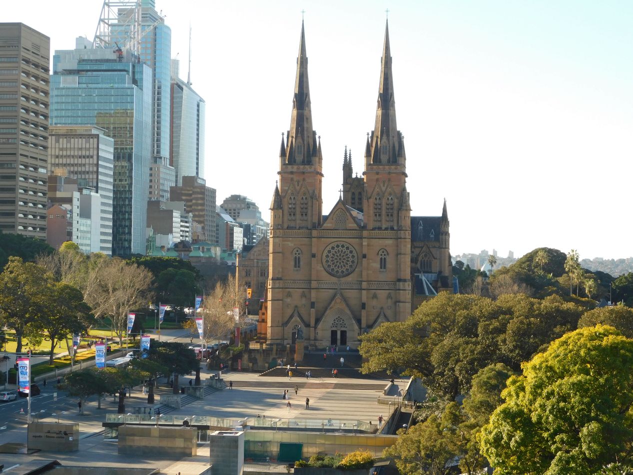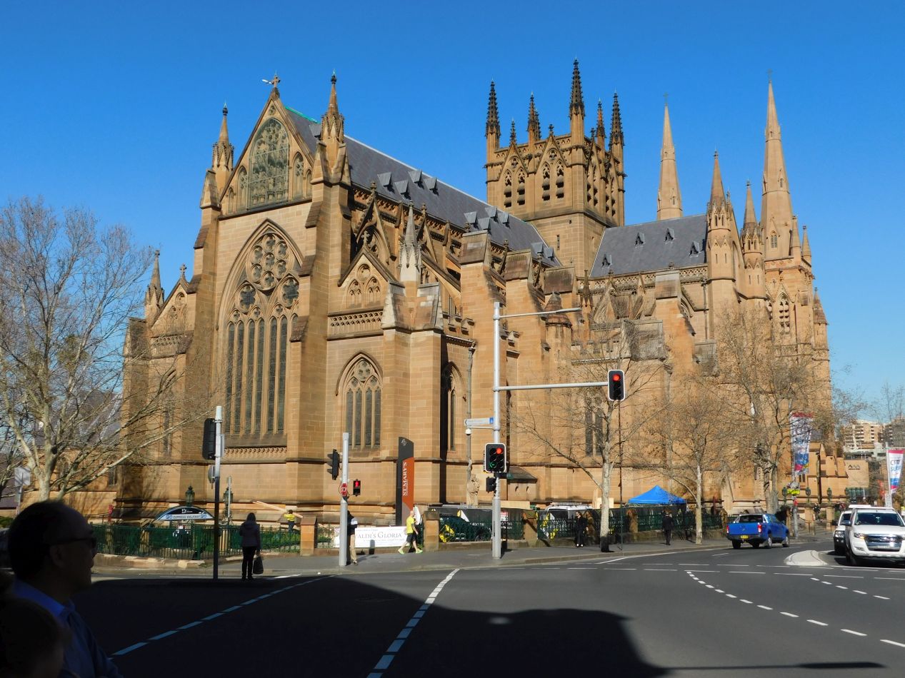 After stopping to grab a quick lunch at a cafe, we continued onwards down Macquarie Street until reaching St. Mary's Cathedral and Sydney's version of Hyde Park. St Mary's Cathedral is a Catholic church built in classic Gothic style, with its medieval architecture looking badly out of place in the midst of the otherwise modern structures in the downtown. This cathedral is both one of the largest and the oldest to be found in Australia, with construction first beginning in the 1860s (after two previous churches on the same spot were destroyed by fire) and lasting for long decades afterwards due to lack of funds. The main nave wasn't finished until 1928 and the spires on the towers weren't added until the year 2000. We tried to enter St. Mary's but had the unfortunate timing to arrive right when a mass was beginning, and didn't end up returning later to photograph the inside. Here's an image from Wikipedia to provide a sense of the interior; based on everything that I can see, it looks like a standard Gothic design without making any major departures from the usual template.