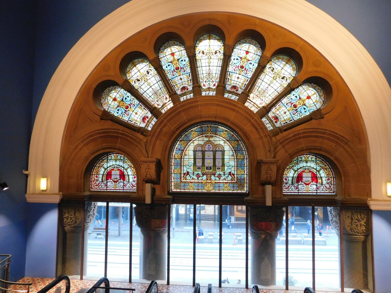 It was a short walk from the Australian Museum over to Sidney's Town Hall building and the center of the business district. The official-looking building with the clock tower was the Town Hall for the city, home to the Lord Mayor and Sidney's local government offices. This structure was built in 1889 in French Second Empire architectural style, and it's probably best known today for having one of the city's busiest rail stations located underneath it. On the other side of the street was the Queen Victoria Building, easily identified due to the presence of the long-reigning queen in the form of a statue outside its entrance. This structure is a Romanesque Revival design completed just before the turn of the century in 1898, one that evokes the grandeur of the fin de siècle period before everything fell apart in the Great War. The Queen Victoria Building was designed for use as a marketplace, and after being used for a variety of different purposes over the years, has one again returned to its role as a commercial shopping mall, albeit a very upscale one. It wasn't that interesting from the outside, but the interior was a different story.