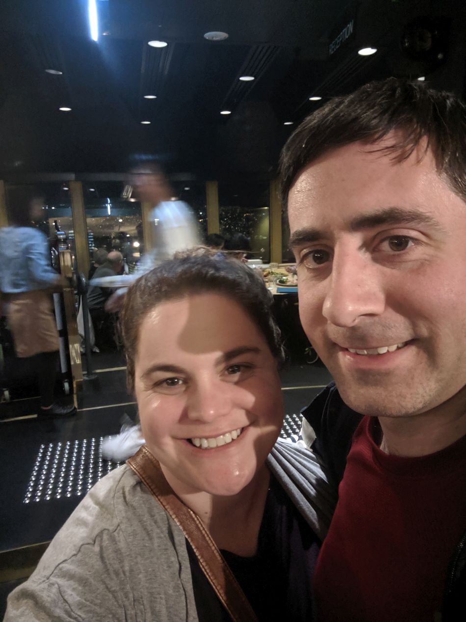 The dinner was an all-you-can-eat buffet with an excellent variety of choices. We both enjoyed the chance to devour unlimited amounts of sushi and made sure to check out some of the more exotic local options for cuisine. Kangaroo steak was on the menu again and proved to be a decent option, but the surprise winner of the night was the emu sausage. The emu meat tasted closer to beef than to chicken, and it proved to be absolutely delicious. I think we both went back for seconds of the emu. As for the views outside, we found that the tower took about 30 minutes to rotate completely around the central spire. It was fun to see many of the places we'd visited earlier that day from above, like St. Mary's Cathedral and the Anzac Memorial. Unfortunately we didn't have a clear view of the harbor due to other skyscrapers in the downtown blocking the path, which meant no pictures of Sidney Opera House and only a glimpse of the Harbor Bridge. It also proved difficult to get a clear image due to the darkness outside, with only a handful of our many attempted photos coming out looking at all decent. This was one place where having our original camera would have been a godsend. It ended up being a wonderful end to our day, even if we did end up eating a little too much food in the process.