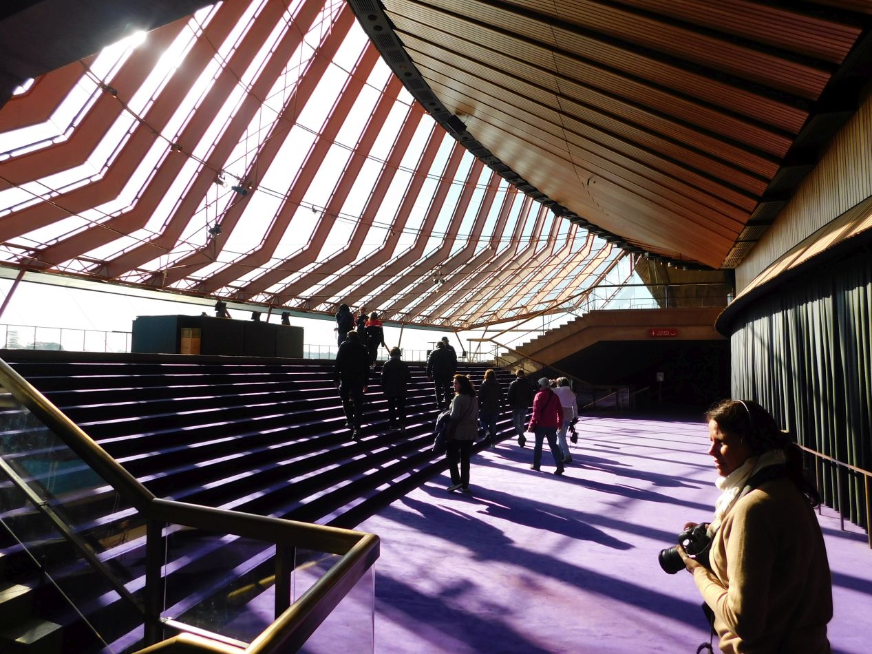 Thanks to the slow pace of the ferry, we just barely arrived in time to catch our morning tour of the famed Opera House. These are some of the pictures of the interior of the concert hall building, one of three main buildings that make up the total opera complex. Our tour guide did an excellent job providing some of the background history of the Opera House, with a great deal of discussion concerning Danish architect Jørn Utzon who put together the award-winning design for the facility. If anything we thought that they gave a bit too much praise to Utzon, whose original design was totally impractical for real-world usage; he conceptualized the Opera House buildings as being open to the air on each side, and didn't bother with the mathematical calculations that would ensure the structure could support its own weight. Nonetheless the building is indeed a marvel of design, and has rightly become the iconic image associated with the city of Sydney. We were able to see the interior of the main concert hall but not able to photograph it due to a performance that was in the process of being set up. Here's the image from Wikipedia for the curious.