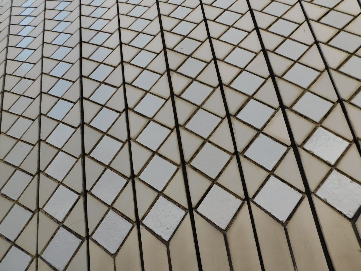 After we passed through the concert hall building, we walked outside across the short distance to the neighboring theatre building, the one used for actual opera performances. There are five different venues in total contained at the Sydney Opera House, ranging from 2700 seats in the concert hall down to 280 seats in the intimate studio performance room. We were able to photograph the Joan Sutherland Theatre, which was between performances at the moment and therefore didn't have any copyright issues to worry about. On the outside of the buildings, we were also able to see up close the "shells" that make up the roof of the Opera House. These glazed ceramic tiles have several different shades of white, which allows them to reflect an ever-changing amount of sunlight throughout the day and create the unique appearance of the complex.