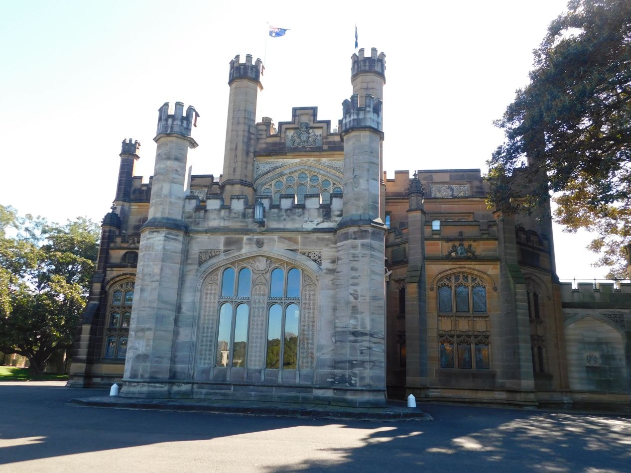 Finished with the Opera House for the moment, we started walking to the south towards the rest of the downtown portion of Sydney (known locally as the "CBD" for the Central Business District). The Opera House is situated right next to the Royal Botanical Gardens, and it was more pleasant to walk through the gardens for a bit as opposed to the busy city streets. The northern end of the gardens contained this formal structure known as Government House, which looked something like a medieval castle plucked out of Europe and deposited here in metropolitan Sydney. Government House was constructed during the 1840s in Gothic Revival style (thus the medieval look), and it has been the home of the Governor of New South Wales since its founding. That use continues to the present day and this is still an active building used for formal state gatherings. We did not stick around to try and take a tour of Government House, and instead paused for a few minutes to admire the exquisitely manicured grounds surrounding the building.