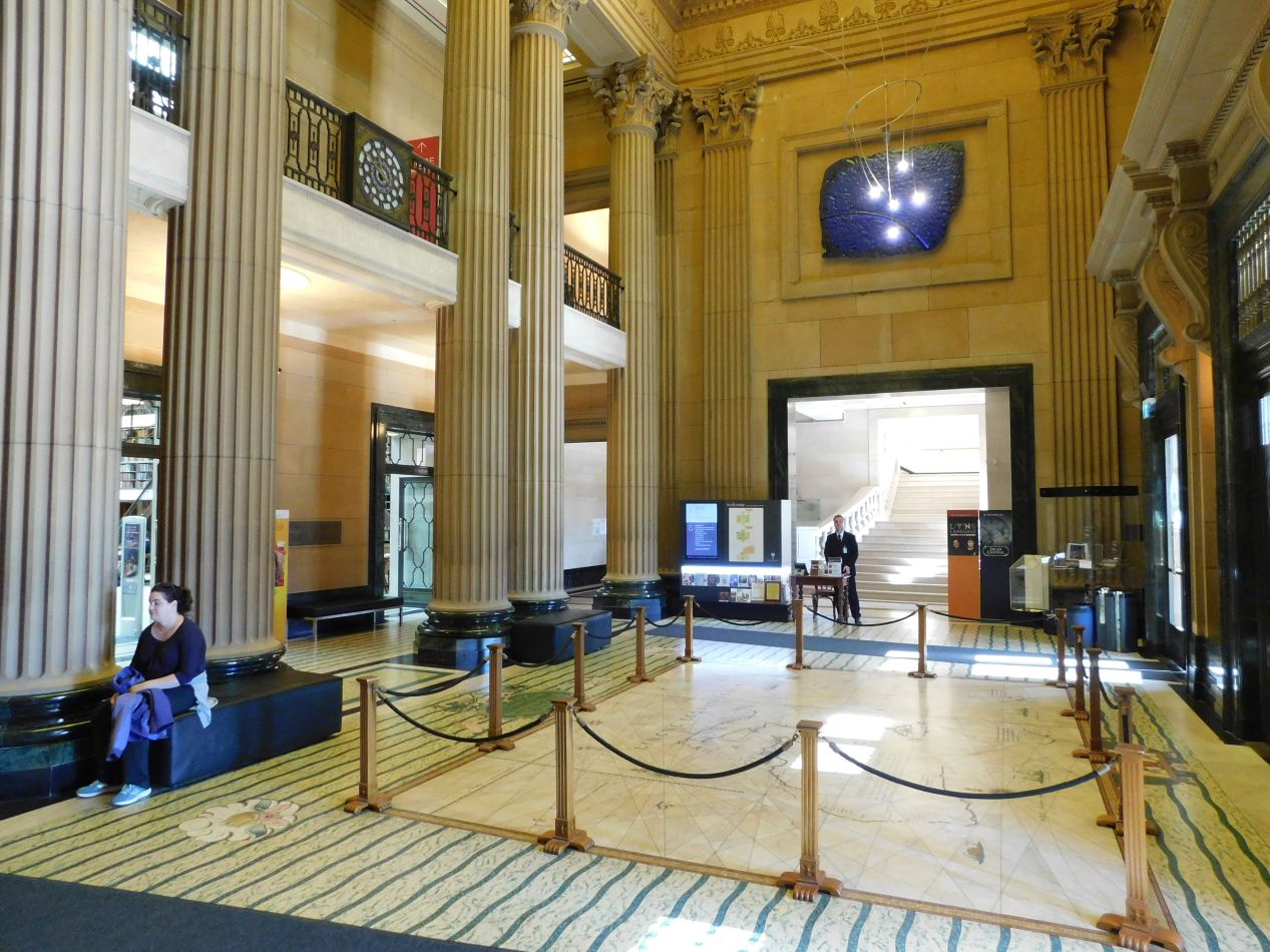 The one other location of note that we saw in the parliament building was this place known as the Jubilee Room. It was constructed as a reading room for the library in 1906 and still contains archival records of the various laws and statutes passed by the New South Wales Parliament among its stacks of books. However, the Jubilee Room no longer primarily functions as a library reading room, and instead sees use for committee meetings and public functions. This would certainly be a beautiful setting for a conference discussion to take place. Up at the top of the room was an elaborate stained glass ceiling, with the central crest stating "Knowledge is the mother of wisdom and virtue". There were even two of those giant old-fashioned globes in the corners of the room, one depicting the earth and the other showing the constellations in the night sky. All in all, this was an impressive room to see and I'm glad that we ran into it by chance as we were wandering the halls of the parliament building.