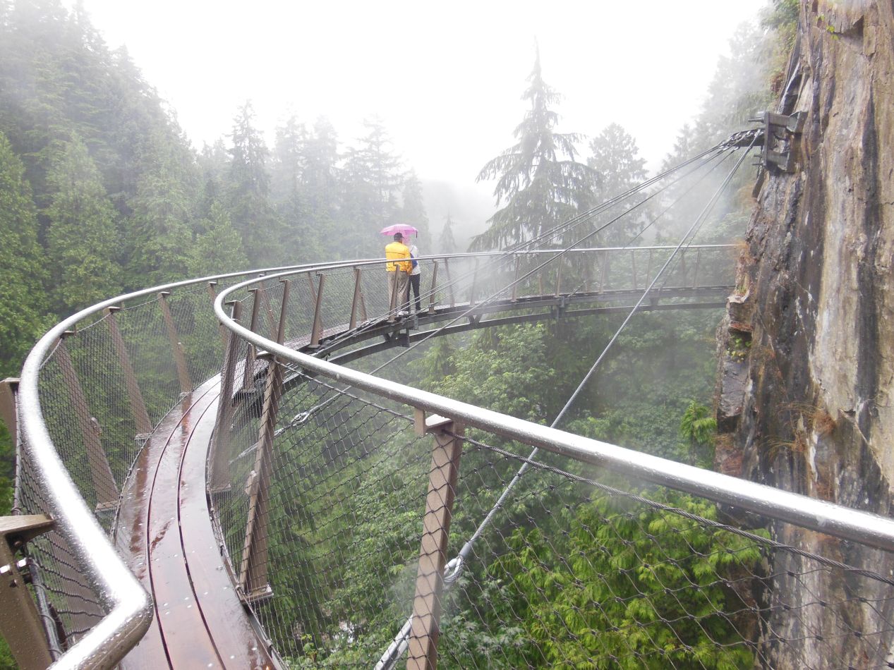 The Capilano Suspension Bridge was surprisingly crowded despite the terrible rain pouring down. There was another display of the same kind of totem pole artwork from local First Nations groups here, although not maintained as well as the similar pieces in Stanley Park. The actual bridge itself was a long and delicate feat of engineering work, stretching some 460 feet / 140 meters from end to end above a gorge below. It was a long drop to the bottom down there, and a small handful of visitors have fallen to their deaths in the canyon below over the years. (In all cases, the individuals were either using hallucinogenic drugs or deliberately climbed over the tall, sturdy railing of their own account - the bridge is quite safe.) The suspension bridge had a significant sway to it and this would not be the place to bring anyone who had a fear of heights. On this rainy, misty day it felt like we were flying through the treetops of the forest.