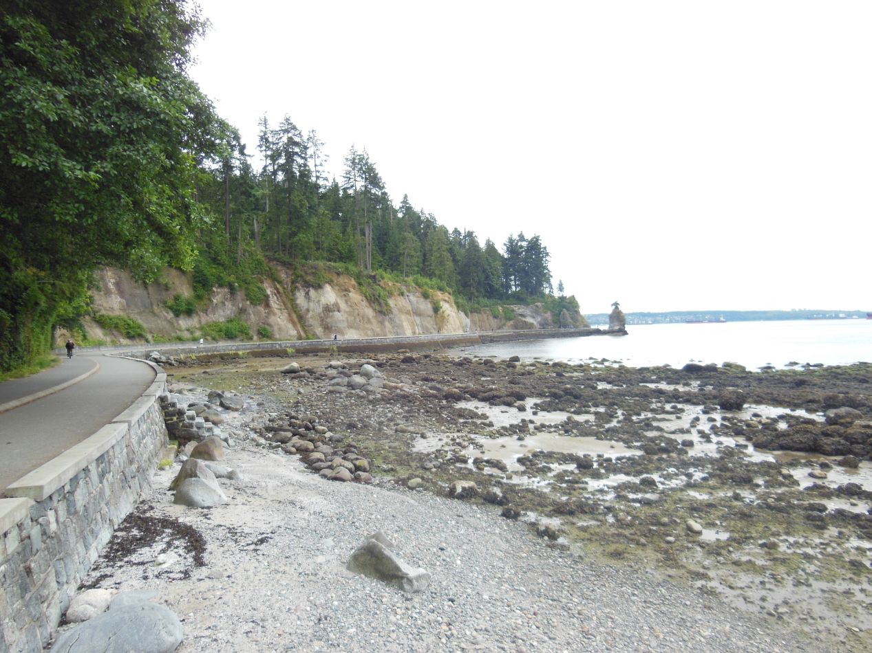 The northern side of Stanley Park was a bit wilder and closer to nature. We crossed underneath the Lions Gate Bridge and followed the seawall along the western edge of the park. The shoreline here was rocky and we were apparently biking at low tide, which exposed an expanse of mud stretching out into the harbor. There were a number of underwater seaweed plants growing here that the flies went after with gusto now that they had been removed from the water, and the whole thing smelled pretty terrible. It was not a particularly attractive site. Further along, we reached the swimming area known as Third Beach, and once again there was virtually no one out there swimming in the water. Only a couple of young kids were even sitting on the beach's logs in swimsuits. It was all pretty though, in a kind of stark fashion, between the cloudy skies and the dense greenery in the park and the rocky, muddy sands of the shoreline. This felt like a more authentic experience of what it's like to live along the Pacific coast for most of the year.