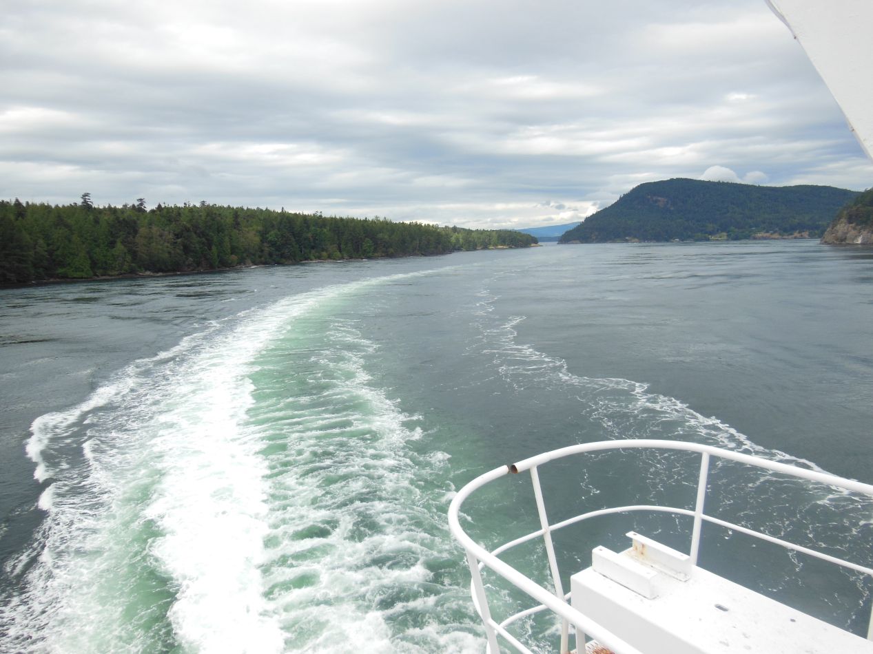 In order to reach the city of Vancouver on the mainland, we had to board another ferry boat. This one didn't leave directly from the harbor in Victoria, instead launching from a more industrialized docking area in the little town of Swartz Bay to the northeast. While this distance is relatively short by air at only about 70 miles / 115 kilometers, the need to cross over water the whole way meant that it took a few hours to travel via boat. After loading up our car on the nondescript ferry boat, we were free to enjoy the passage back to the mainland. The ferry ventured past a series of picturesque small islands lying in the Straight of Georgia between Vancouver Island and British Columbia. These islands were densely forested aside from a handful of houses perched against the shoreline. These vacation getaway homes looked to be very expensive indeed, given the difficulty of reaching these exclusive destinations. The channel of water between Galiano Island on the left and Mayne Island on the right was particularly narrow, only a few hundred feet at the closest point, and the houses on the shore were almost close enough to reach out and touch them. The nearby scenery on these little islands made this one of the more enjoyable ferry trips, certainly more interesting than the unbroken passage from Port Angeles to Victoria a few days earlier.
