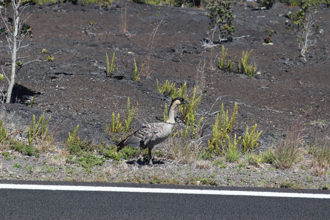 Speaking of wildlife, we had a great stroke of fortune almost immediately upon reentering the park. We were heading to the southern end of the park on the Chain of Craters Road when Liz spotted this bird along the side of the road. It was a Nene or Hawaiian goose, an animal endemic to the islands which serves as the state bird for Hawaii. Nenes are a threatened species with fewer than 4000 of them remaining in the wild, making them the world's rarest type of goose. They nearly became extinct before a successful breeding population helped rebound their population; that 4000 number might be low but it's up from an estimated nadir of only 800 Nenes around the year 2000. This is a beloved animal in Hawaii for its beautiful plumage and distinct call which sounds like "nene" and gave the bird its name. We were really lucky to spot one literally minutes after passing by the "Nene Next 5 Miles" road sign - the warning proved to be prophetic!