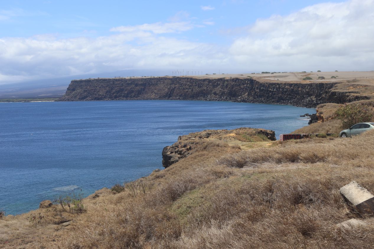 It was a drive of another 15-20 minutes continuing onwards from Paradise Meadows Orchard before we began to approach the southern tip of the island. The terrain here was nothing like what I would have imagined for Hawaii, a dry semi-arid climate with long brown grasses where horses and cattle were being grazed. It looked more like the Great Plains than an island in the Pacific Ocean! The road eventually reached its conclusion in a small parking lot located next to these dramatic cliffs. Here the same volcanic rock that we'd been seeing everywhere plunged down into the crystal blue waters of the ocean below. Despite its somewhat remote location there was a small crowd of visitors gathered here to enjoy the sights: