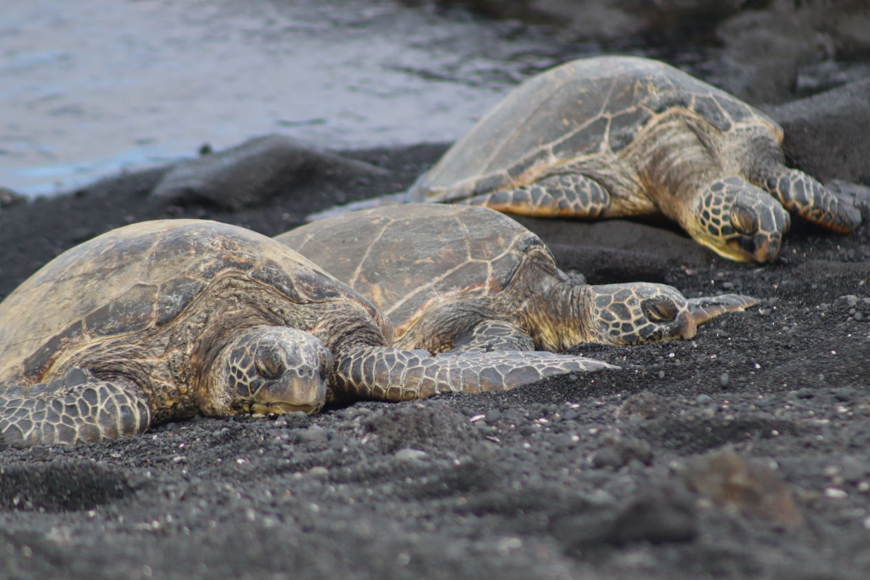 Punalu'u Beach is also known for being a frequent place to encounter sea turtles. Sure enough, luck was with us and there were a trio of green turtles relaxing along the edge of the beach in a protected area specifically built for their use. The green turtles or honu in Hawaiian are a threatened species that like to feed on the red seaweed that grows amongst the rocks at Punalu'u Beach. The presence of tourists doesn't seem to bother them any more than it had when we spotted sea turtles back on the North Shore of Oahu at Laniakea Beach. Most of the tourists were gathered around the sea turtles to snap pictures of them (as we were also doing), with only a few hardy souls braving the ocean itself. Generally speaking, all of the main beaches on the Big Island are located on the western side in the Kailua-Kona region, with the eastern side of the island having rougher surf conditions which don't lend themselves to swimming.