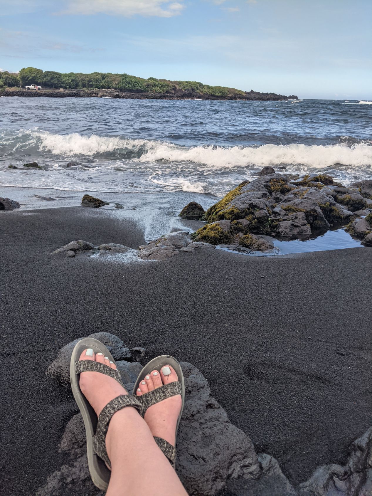 The bakery where we ate lunch turned out to have taken its name from this nearby seaside attraction, Punalu'u Beach. This is one of Hawaii's most famous beaches due to the presence of volcanic black sand made of basalt and created by lava flowing into the ocean. I had heard of black sand beaches before without ever seeing anything like them in person; sure enough, the sand really was made up of dark black pebbles that crunched underfoot. Larger rocks of the same volcanic basalt also littered the waterfront, and when combined together with cold fresh water flowing into the ocean and the rough waves pounding the beach, it turned out that Punalu'u wasn't a very good beach for swimming. We had thought about getting our beach stuff and decided that we were content to walk along the shoreline without putting on bathing suits.