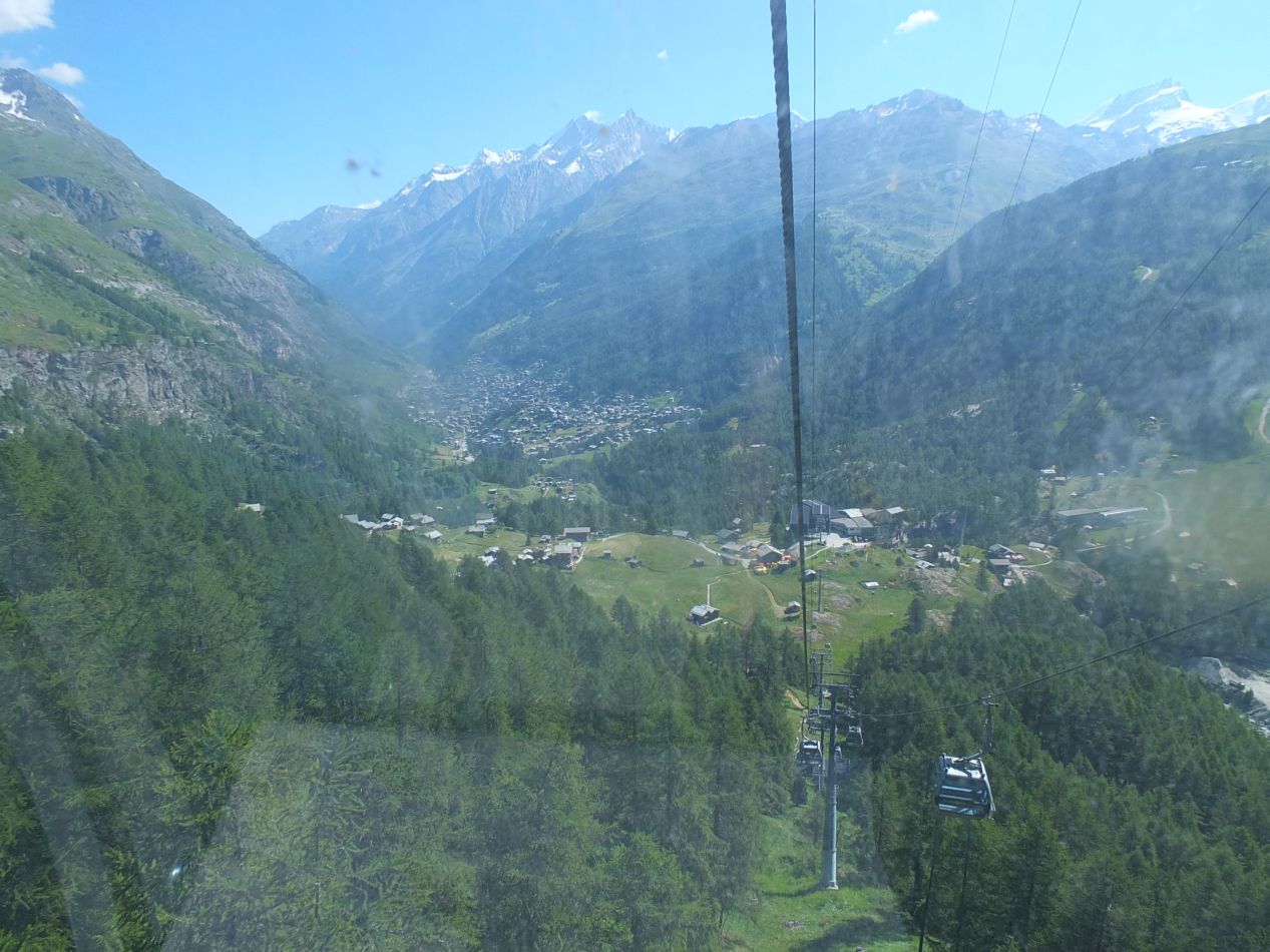 The cable cars provided a perfect opportunity to take more pictures of the amazing natural scenery on the ascending ride. First up was the tiny cluster of buildings called Furi, which was too small even to be called a town. These little wooden buildings were about 500 vertical feet above Zermatt, and made the town below look like a metropolis in comparison. As the elevation continued to increase, the trees that had blanketed the slopes below began to fall away, leaving patches of bare rock. Few plants could survive at these altitudes, which must have been buried under snow for much of the year. The Matterhorn itself continued to loom larger and larger as the cable car rose upwards.