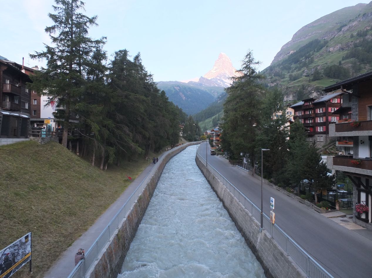 My final views of Zermatt came the next morning, as I was departing in the early hours to catch my next train. The sun had risen but failed to clear the surrounding mountains as yet, providing a soft ambient light as I walked through the empty streets. There were a handful of other tourists who had woken up to catch the same train, but otherwise it was deserted. When I crossed the bridge over the small stream in the center of town, I was able to capture this picture of the Matterhorn in the distance. The mountain's southern face was shining in the morning sunlight, even as the valley below remained shadowed with the last lingering traces of night. Despite all of the overpriced expenses and the difficult hiking, I was still glad that I had chosen to come here. The memories that I made in the one day I spent here will stick with me for a very long time.